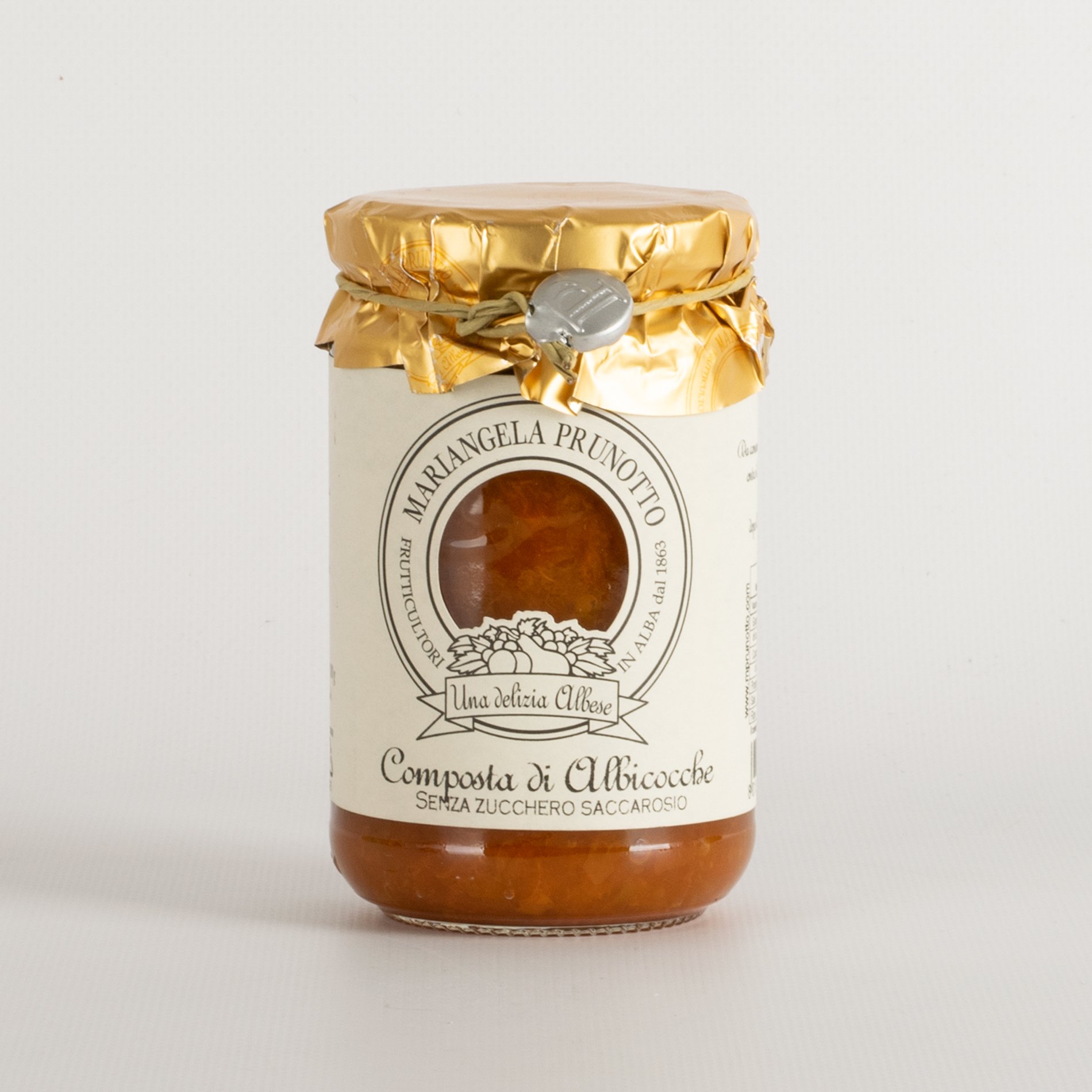 Le albicocche coltivate dall'azienda agricola di Mariangela Prunotto vengono lavorate dopo poche ore, e cotte senza aggiungere zucchero. Solo una piccola quantità di fruttosio viene aggiunta per ottenere una composta completamente naturale e con il vero sapore della frutta fresca rispettando la tradizione piemontese.