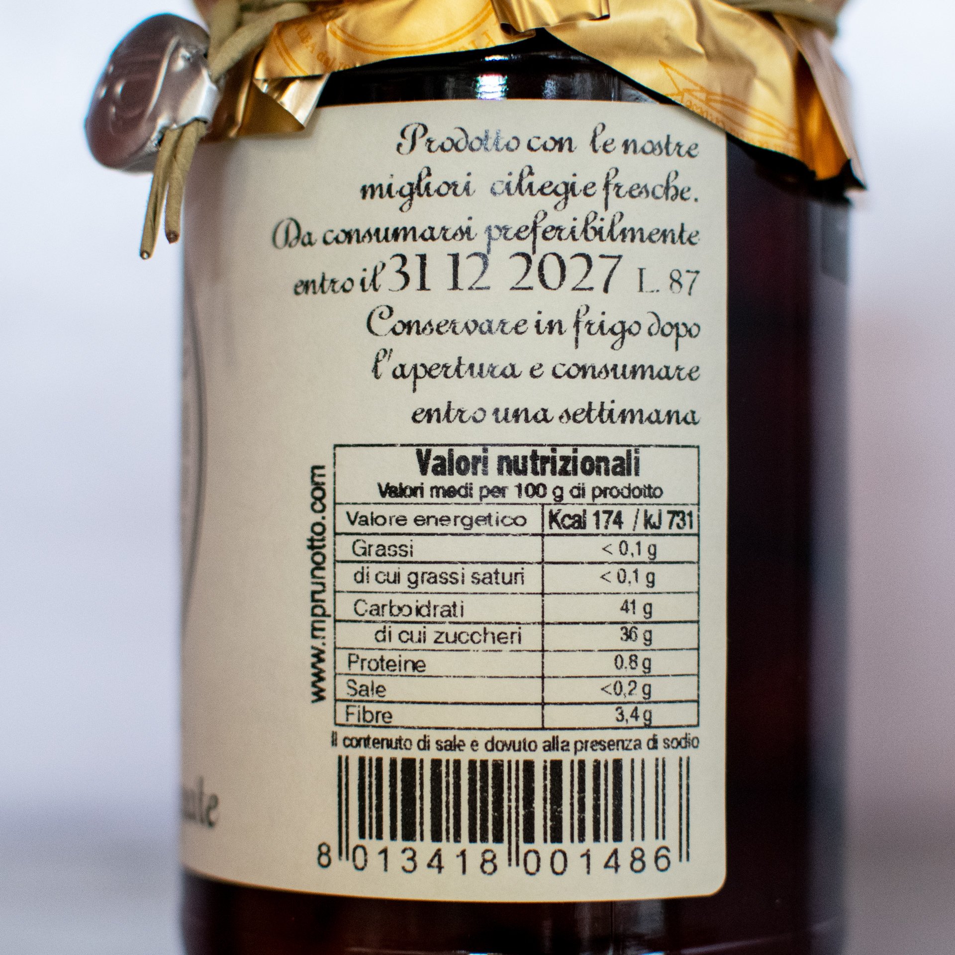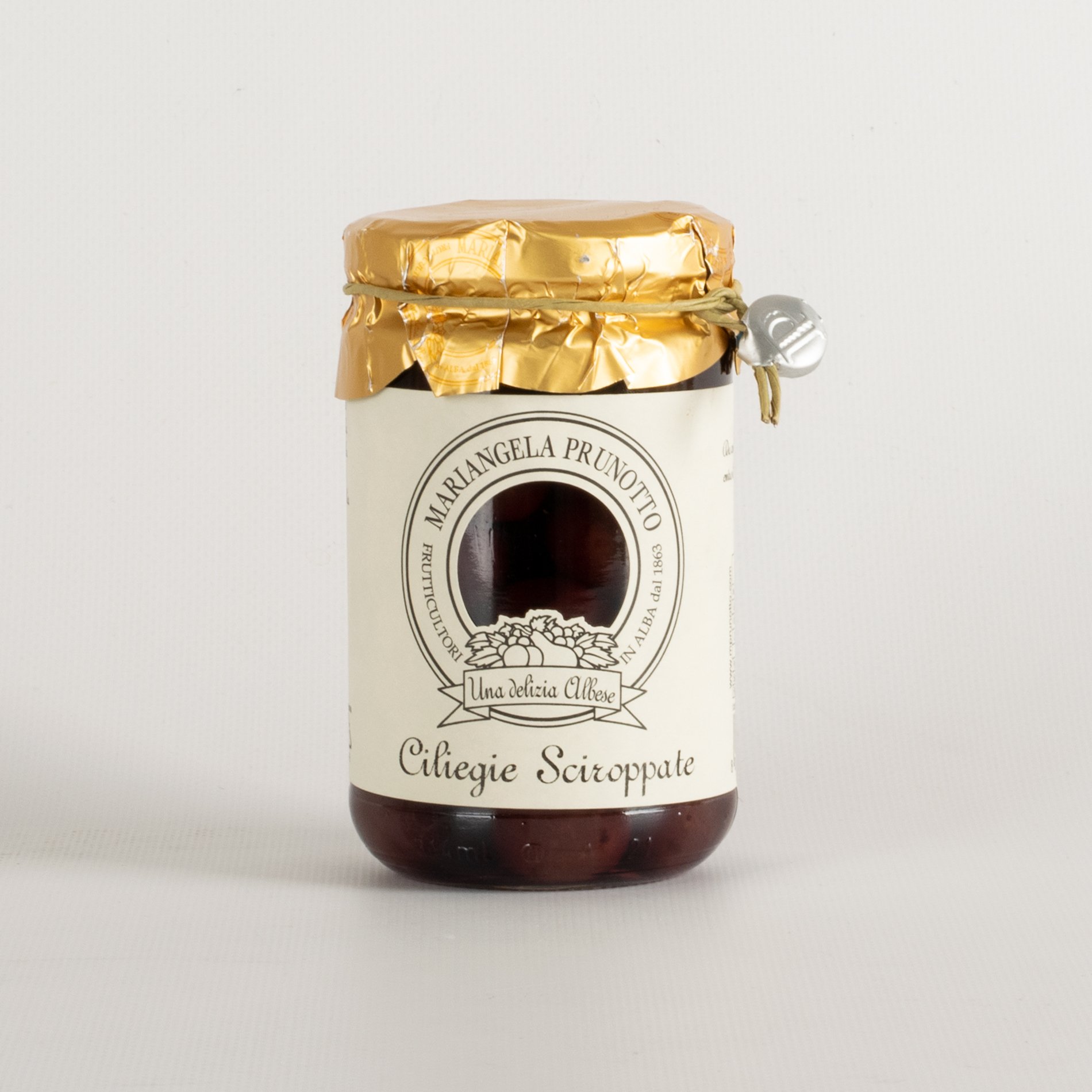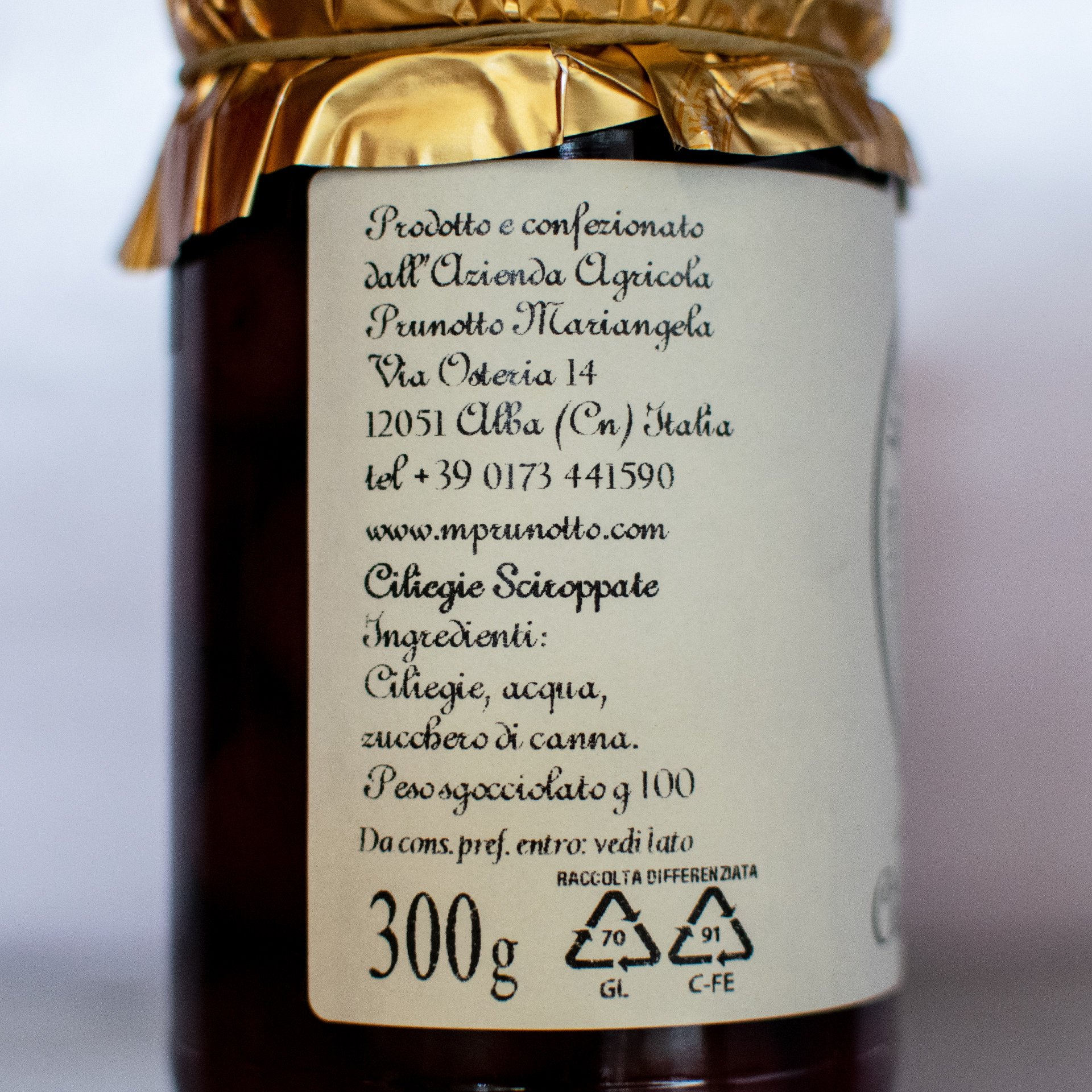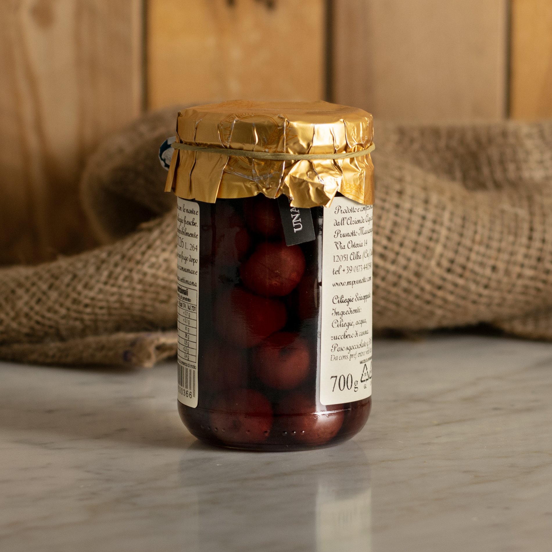 Le ciliegie dell'Azienda Agricola Prunotto Mariangela vengono raccolte rigorosamente a mano più volte nella stagione per rispettare la maturazione naturale e per permettere di avere un prodotto maturo al punto giusto. Si ottiene in questo modo una materia prima naturalmente dolce e di ottima qualità che viene lavorata dopo poche ore dalla raccolta, aggiungendo lo sciroppo naturale “light” fatto con acqua e zucchero di canna.