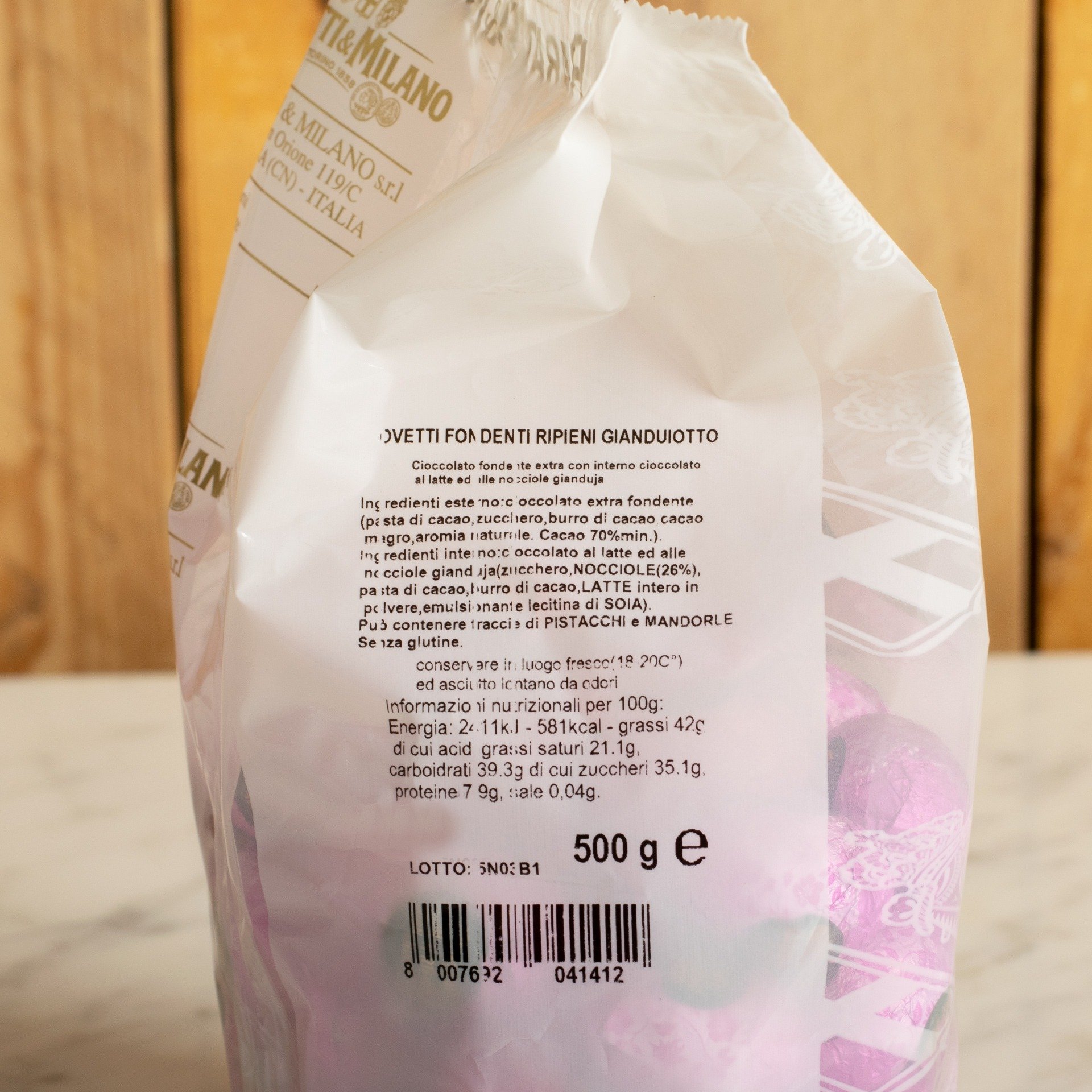 Feine Extra-Zartbitterschokoladen-Ostereier gefüllt mit Gianduiotto, wo die Intensität der Extra-Zartbitterschokolade auf ein weiches Gianduiotto-Herz trifft. Ein harmonischer Kontrast zwischen kräftigen Noten und umhüllender Süße, für ein reichhaltiges und raffiniertes Geschmackserlebnis, perfekt für Liebhaber besonders intensiver Schokolade.