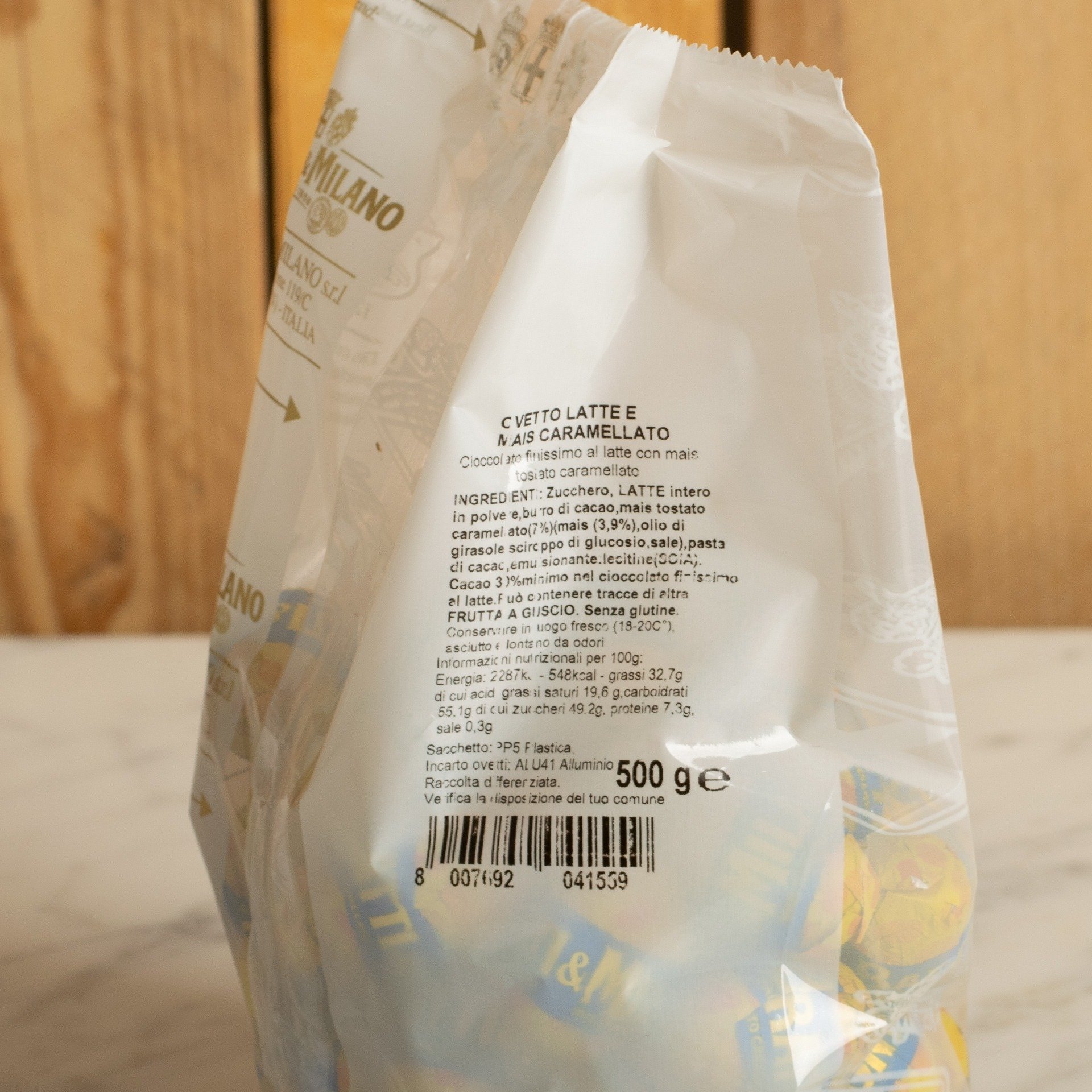 Zucker, Vollmilchpulver, Kakaobutter, karamellisierter gerösteter Mais (7%) (Mais (3,9%), Zucker, Sonnenblumenöl, Glukosesirup, Salz), Kakaomasse, Emulgator: Lecithine (Soja). Kakao: mindestens 30% in feiner Milchschokolade. Kann Spuren von anderen Schalenfrüchten enthalten. Glutenfrei.