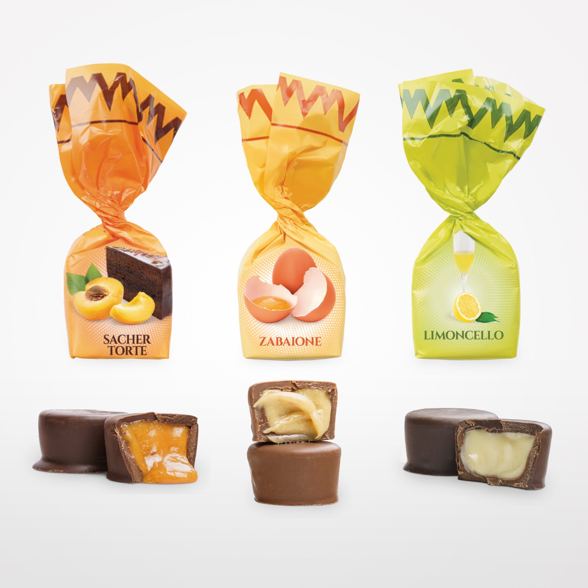 Zartbitterschokolade 31 % (Kakaomasse, Zucker, Kakaobutter, Emulgator: Lecithine (SOJA), natürliches Vanillearoma), Milchschokolade (Zucker, Kakaobutter, Vollmilchpulver, Kakaomasse, Emulgator: Lecithine (SOJA), natürliches Vanillearoma), Vanillepudding (H-MILCH, Kristallzucker, Dextrose, pasteurisierte Eier, Weizenmehl Typ „0“), weiße Schokolade (Zucker, Kakaobutter, Milchpulver, Emulgator: Sonnenblumenlecithine, natürliches Vanillearoma), Zitronenalkoholaroma 5 % (Alkohol, Wasser, natürliche Zitronenaromen, Aroma, natürliches Aroma), Invertzucker, Wasser, Limoncello 0,15 % (Wasser, Alkohol, Zucker, Zitronenschale (Sfusato Amalfitano)), ätherisches Zitronenöl. Kann Nüsse (Haselnüsse, Pistazien, Mandeln) und glutenhaltiges Getreide enthalten.