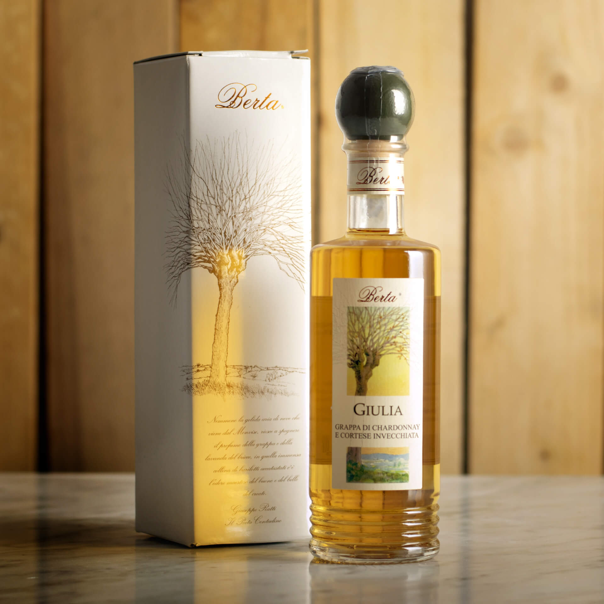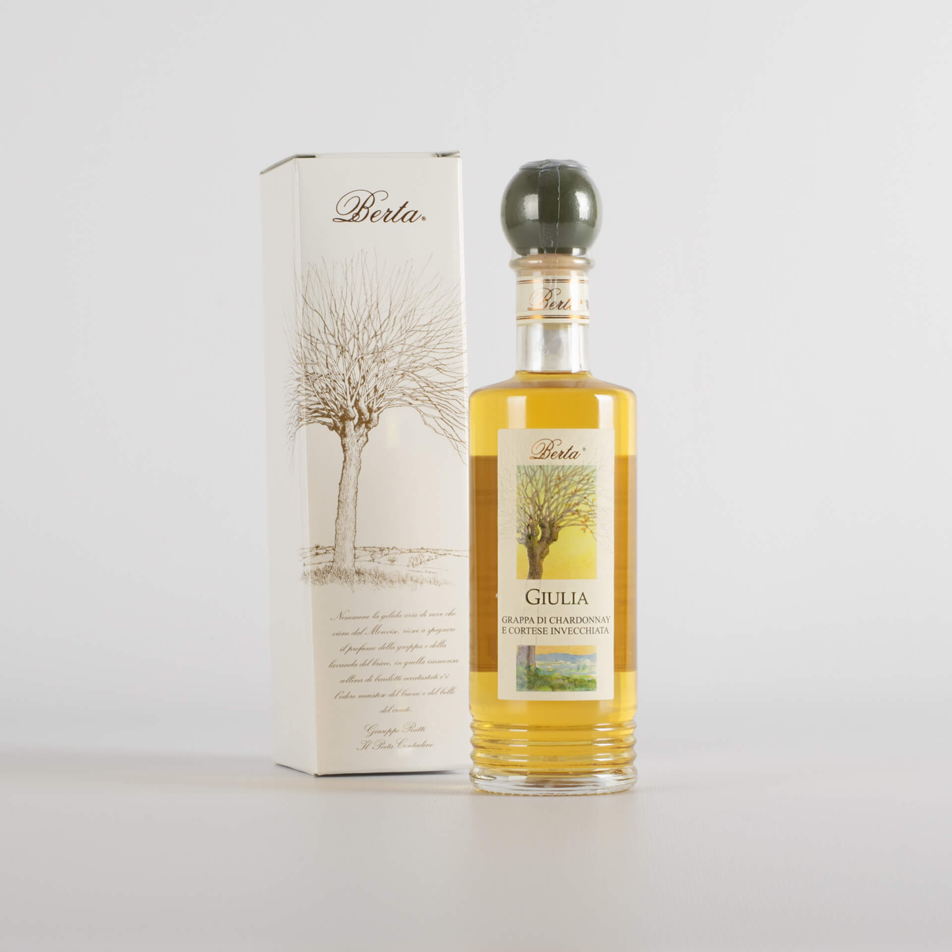 | La grappa Giulia nasce dalle vinacce di Chardonnay e viene distillata con il metodo discontinuo in caldaie di rame a vapore. Il suo profumo è elegante, armonioso e pronunciato. |