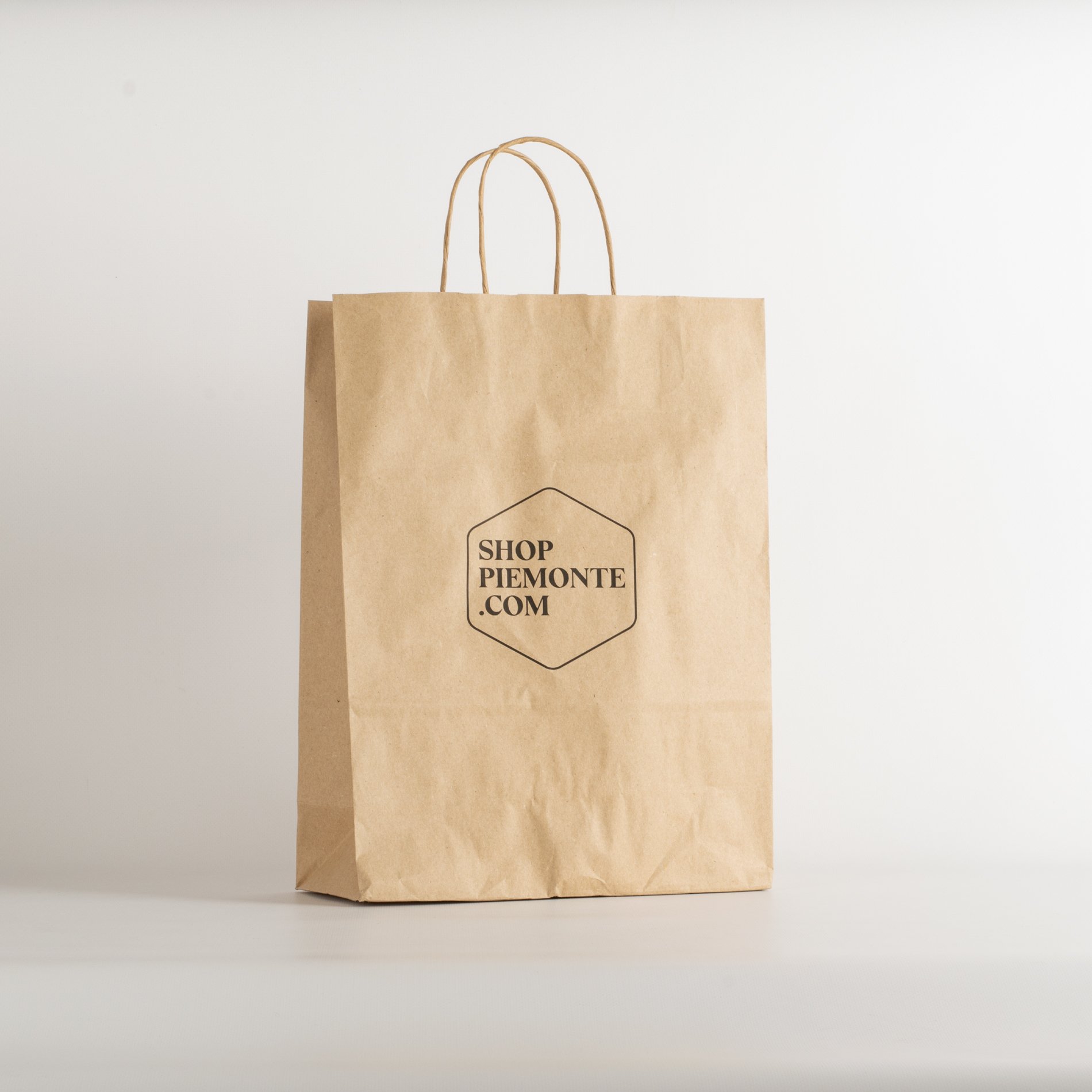 Neuer Shopper aus havanafarbenem Papier mit der Marke Shopiemonte, für eine einzigartige Geschenkbox zum Verschenken zu jedem Anlass.
