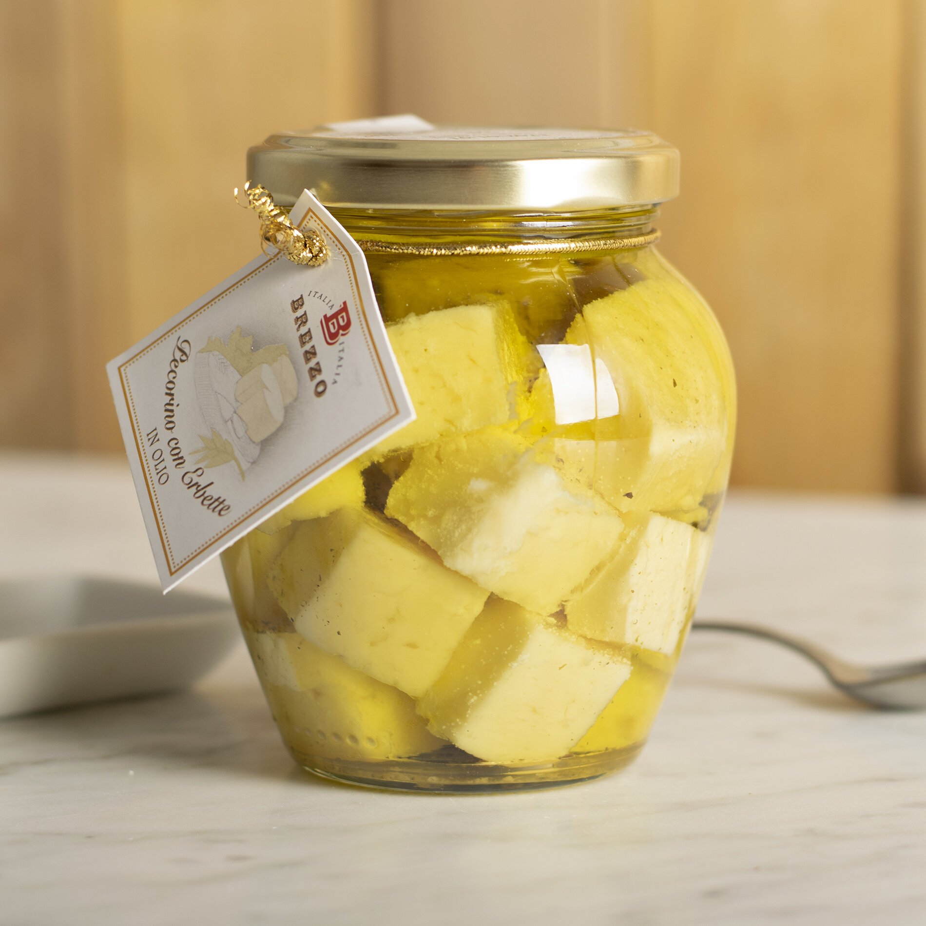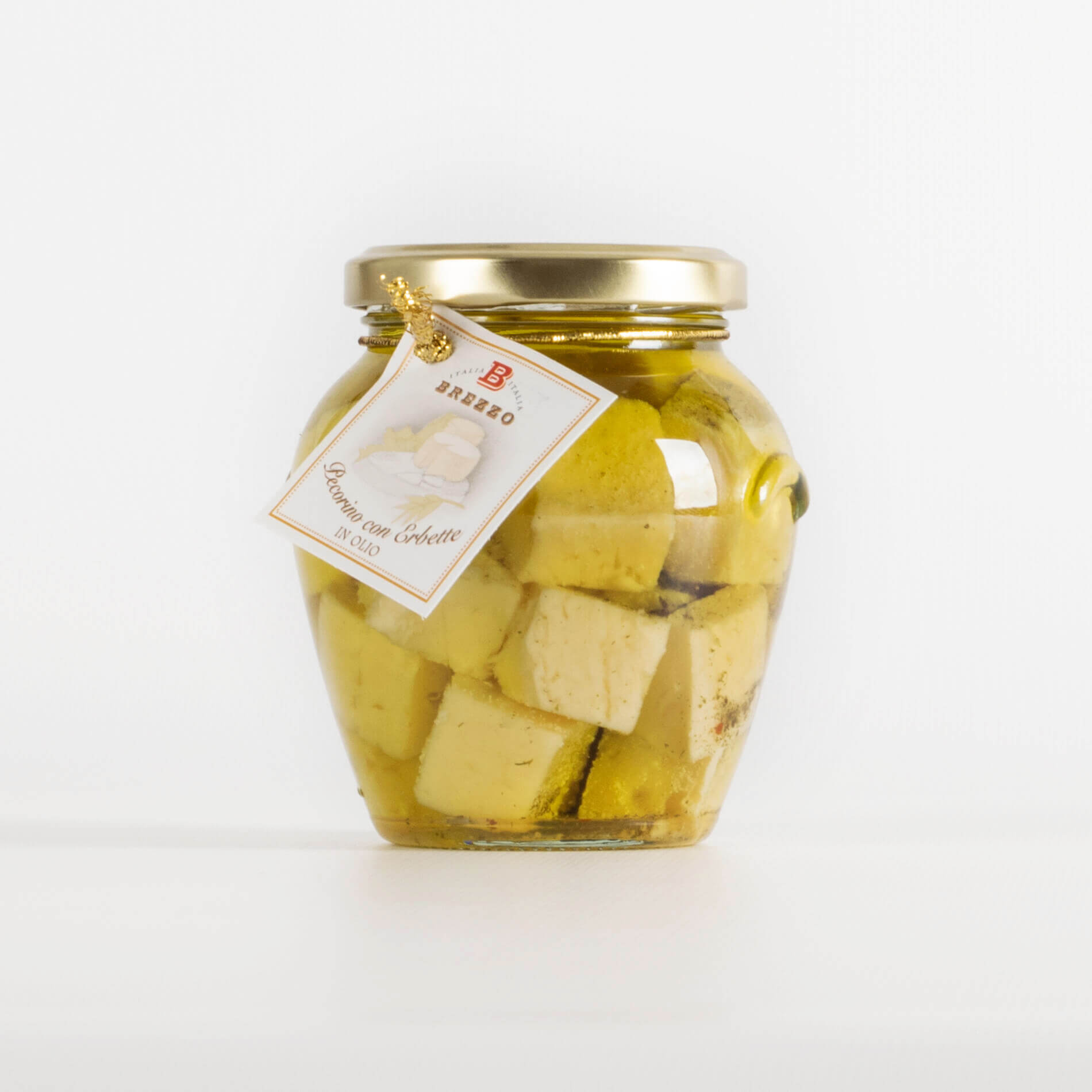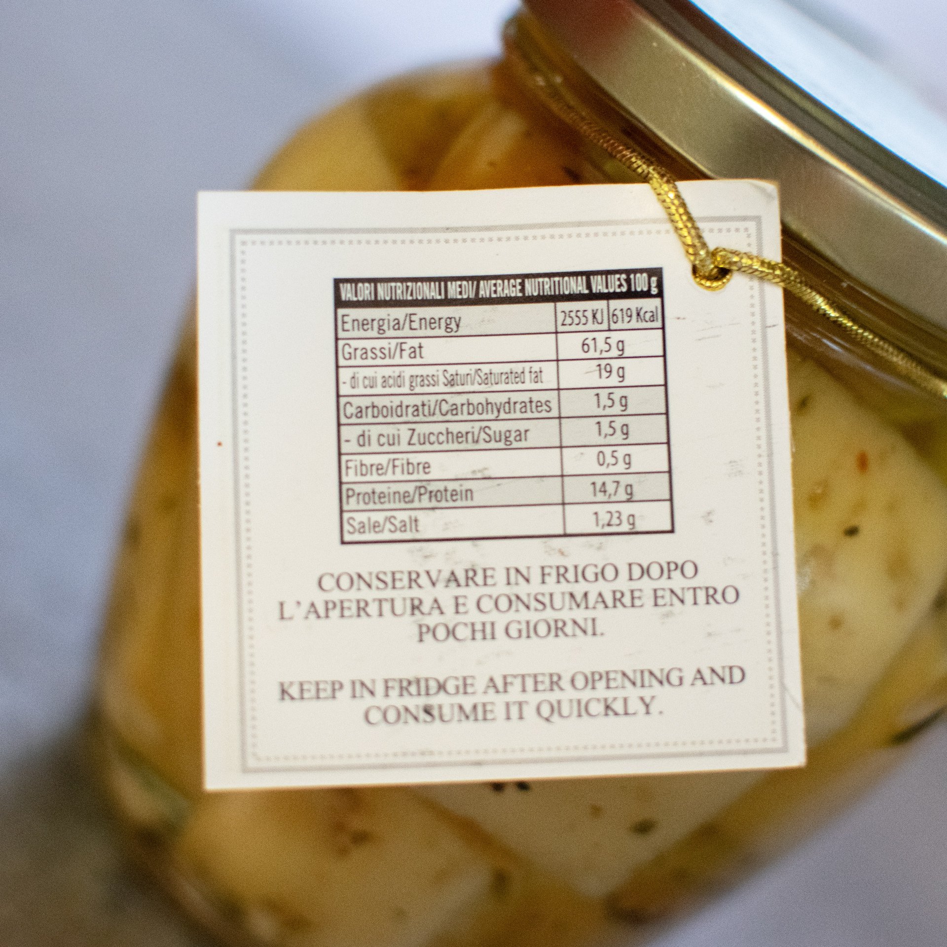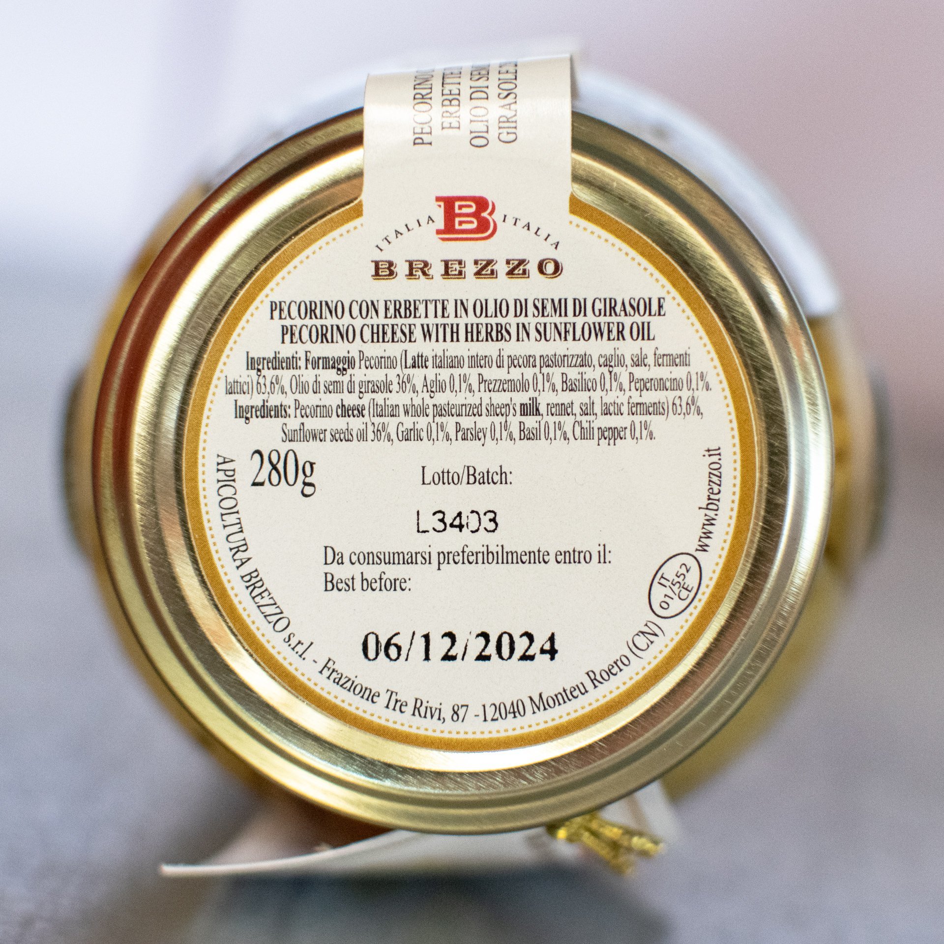 Pecorino-Käse 63,6% (Schafsmilch, Salz, Lab), Sonnenblumenöl 36%, Knoblauch 0,1%, Petersilie 0,1%, Basilikum 0,1%, Chili 0,1%.
