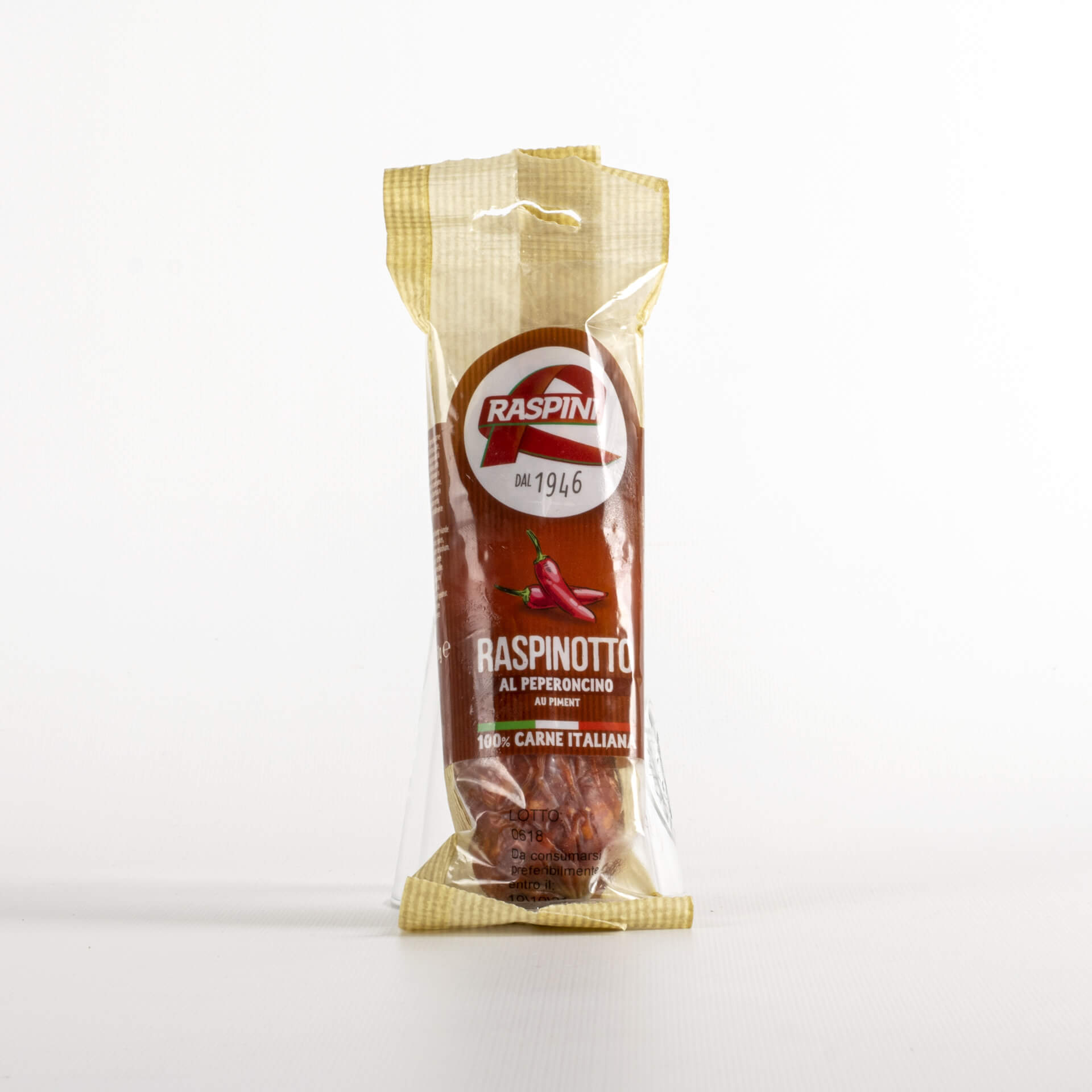 Raspinotto Ambient verfügt über eine Mischung aus bestem Schweinefleisch 100 % italienischer Herkunft, eine hochwertige Rezeptur. Die innovative Verpackung ermöglicht eine bequeme Lagerung außerhalb des Kühlschranks. Das Produkt ist glutenfrei, milchfrei und milchfrei.