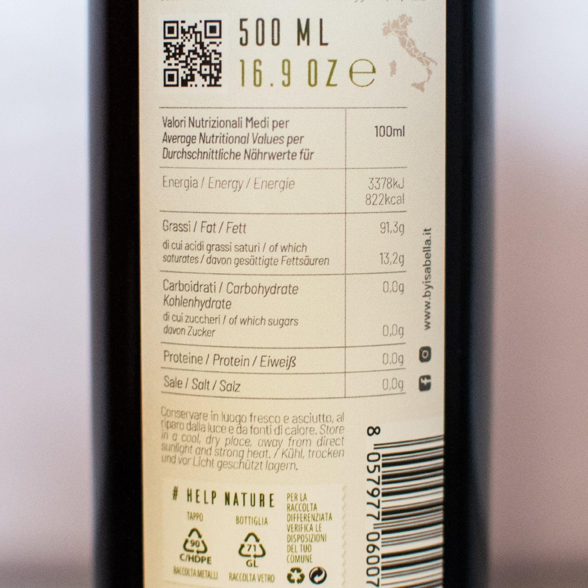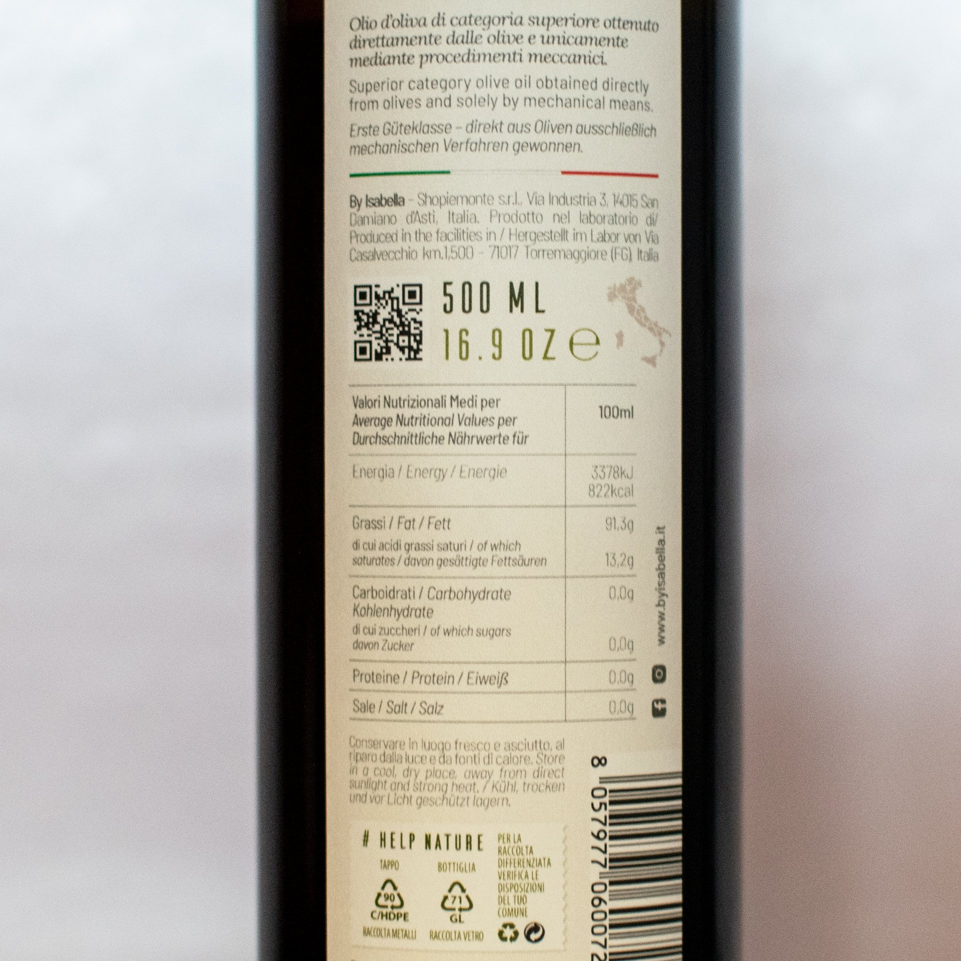Aufgrund des hohen Gehalts an Polyphenolen und Ölsäure kann es als Öl mit nutrazeutischen Eigenschaften angesehen werden. Äußerst vielseitiges Öl, hervorragend in Kombination mit feinen Fleischstücken (piemontesische Fassona), frischem Gemüse, Getreide- und Hülsenfruchtsuppen, Frisch- und Burrata-Käse, Fior di Latte-Eis (wirklich ein Genuss) mit einem Schuss Öl.