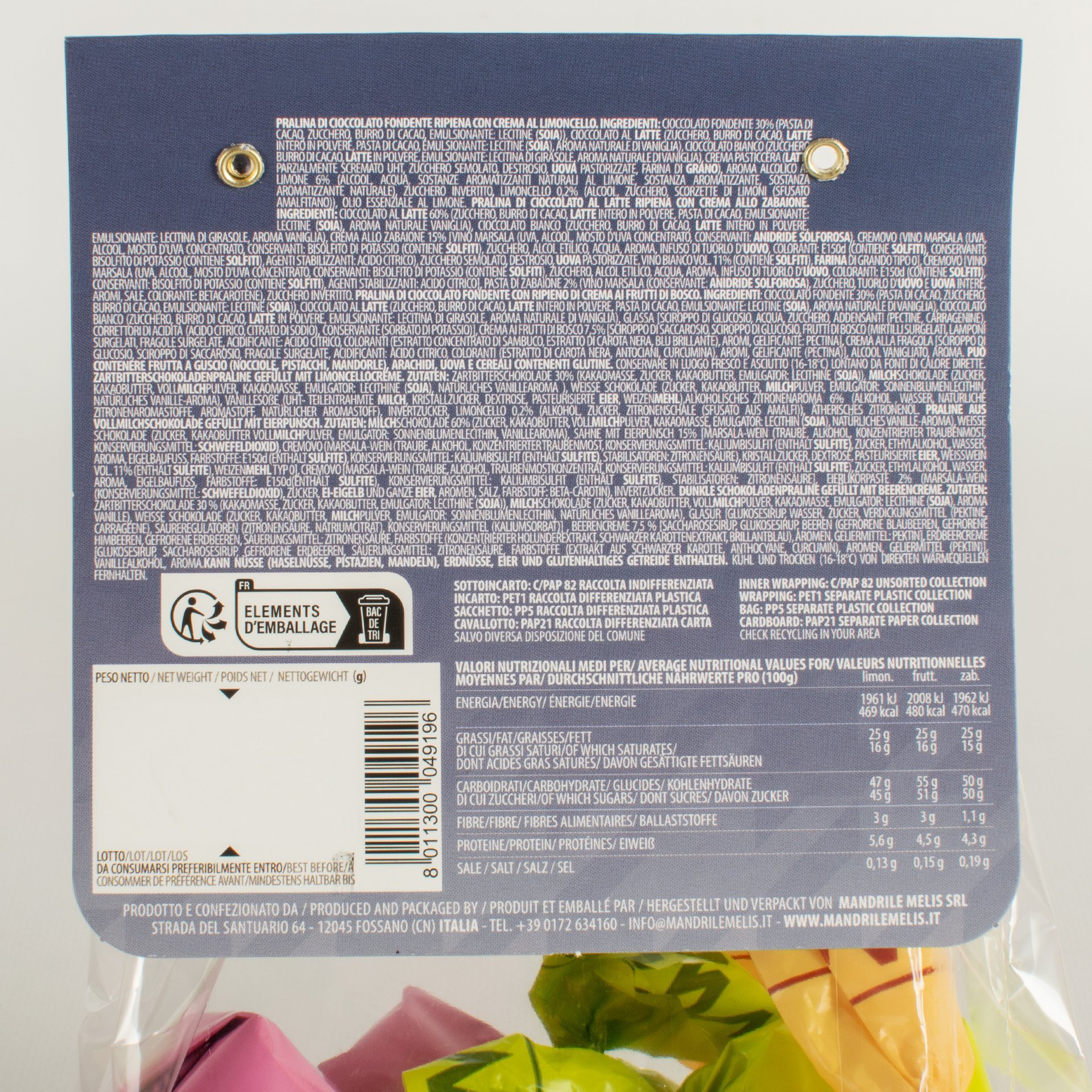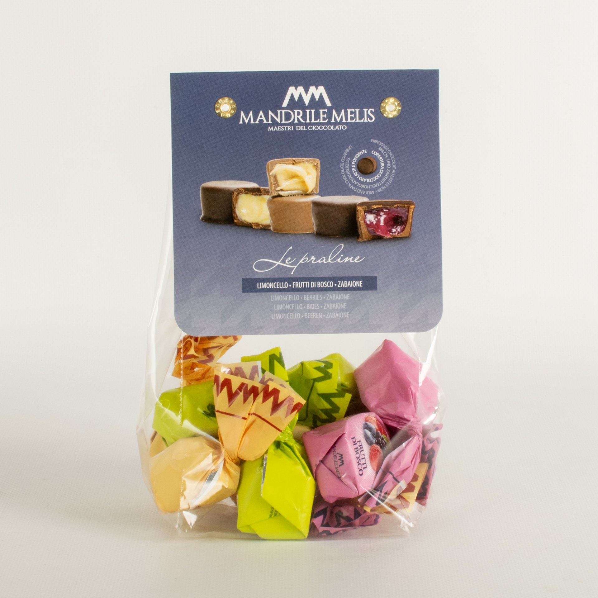 Die verschiedenen Likörpralinen von Mandrile Melis überzeugen durch ihre Zartheit und Süße. In dieser Tüte finden Sie die Geschmacksrichtungen Limoncello, Beeren und Zabajone; wahre Köstlichkeiten, die es zu entdecken gilt! Lassen Sie sich vom Geschmack verzaubern!