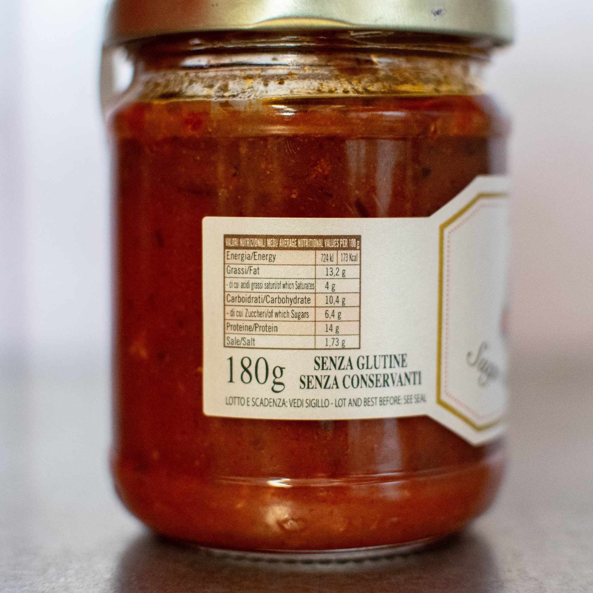 Italian tomatoes, pork meat Italian origin (fresh and smoked bacon) 22%, onions, extra virgin olive oil, salt, sugar, parsley, chili pepper, natural spices, smoked aroma.