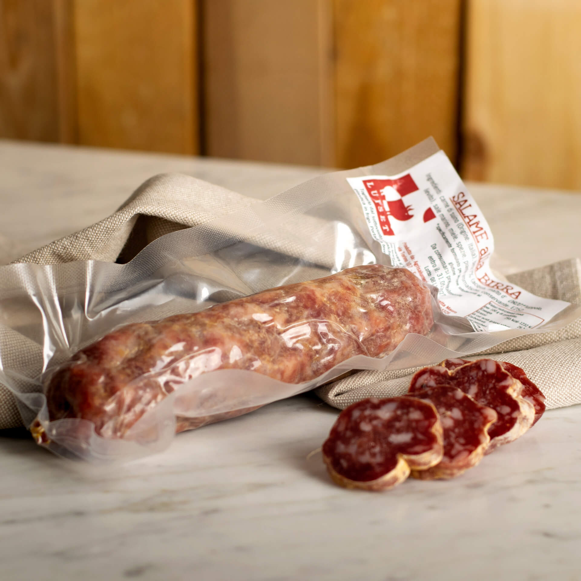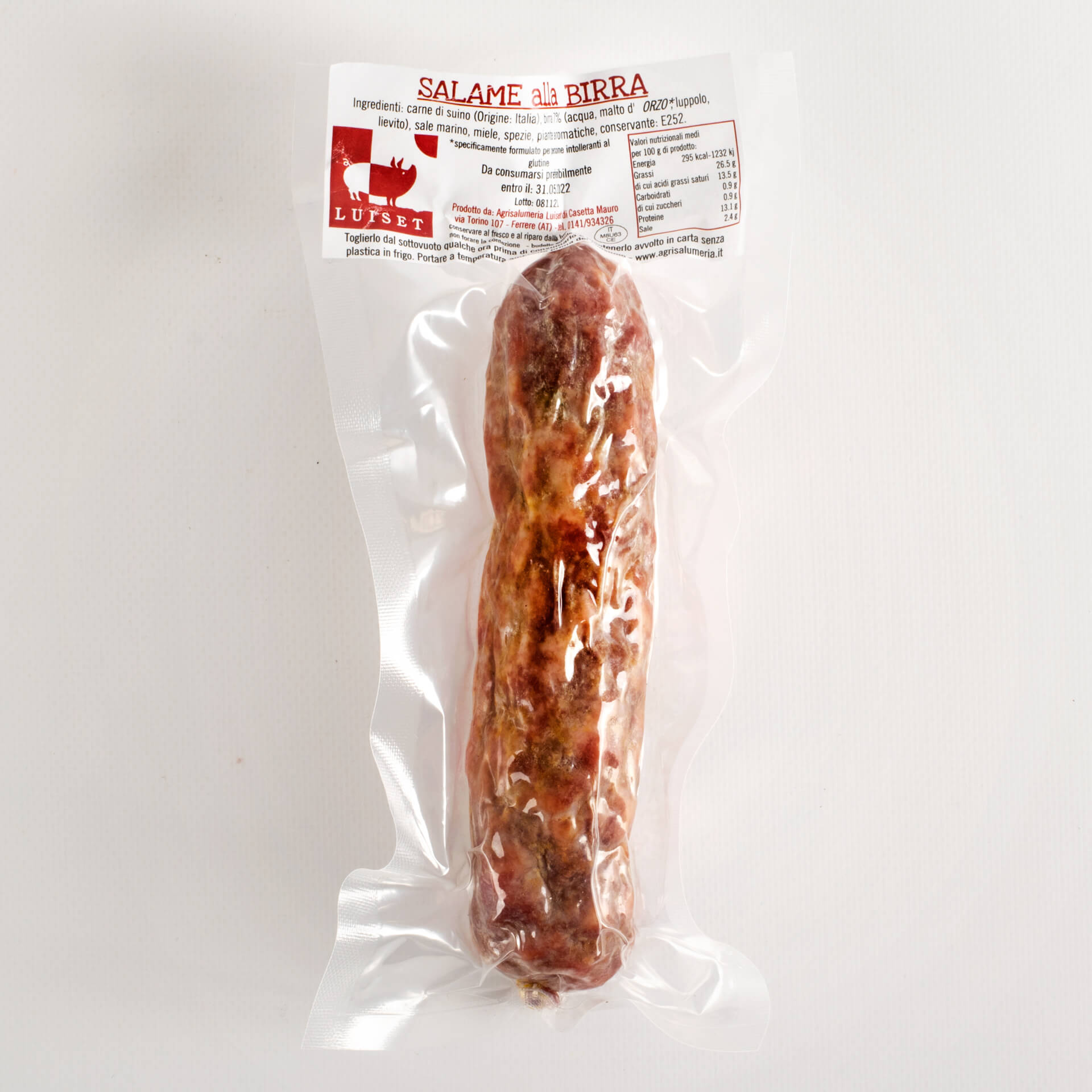 Raw salami prepared with noble cuts of pork, flavored with aromatic herbs and spices. Stuffed in natural casing and slowly matured to obtain a product that is soft to the touch and pleasant to the palate. To the mixture of this salami, instead of the traditional red wine, we add gluten-free craft beer to create an original and curious mix of flavors.