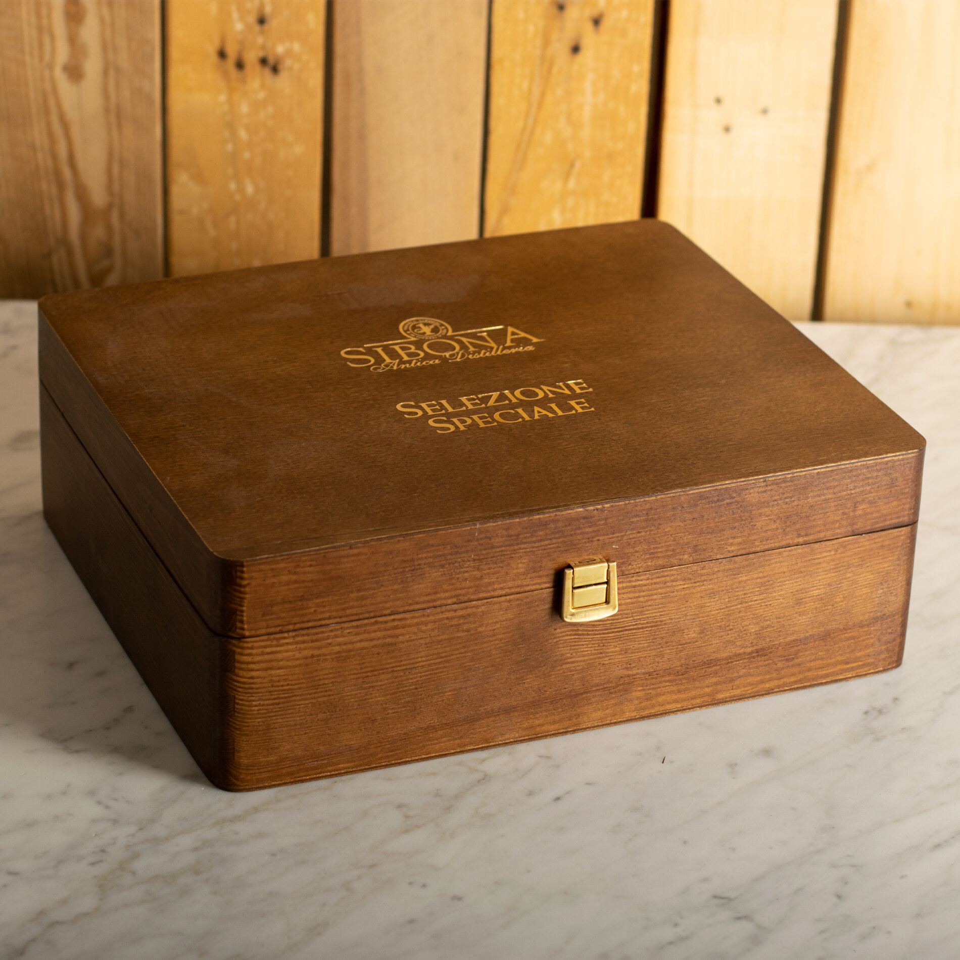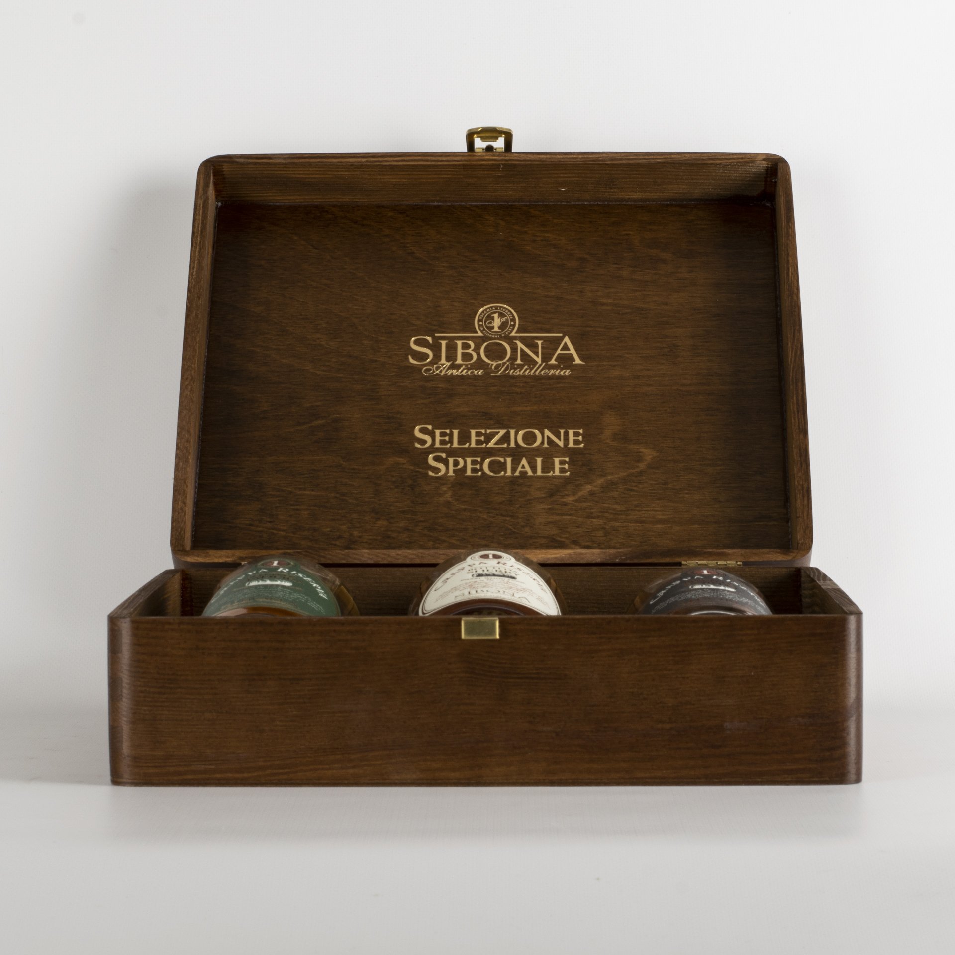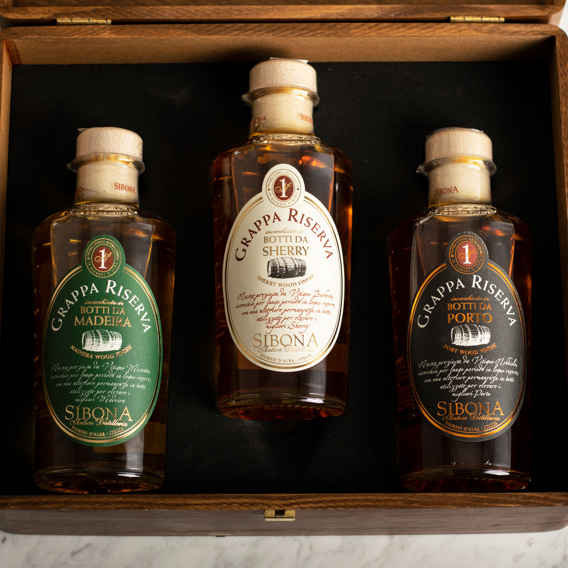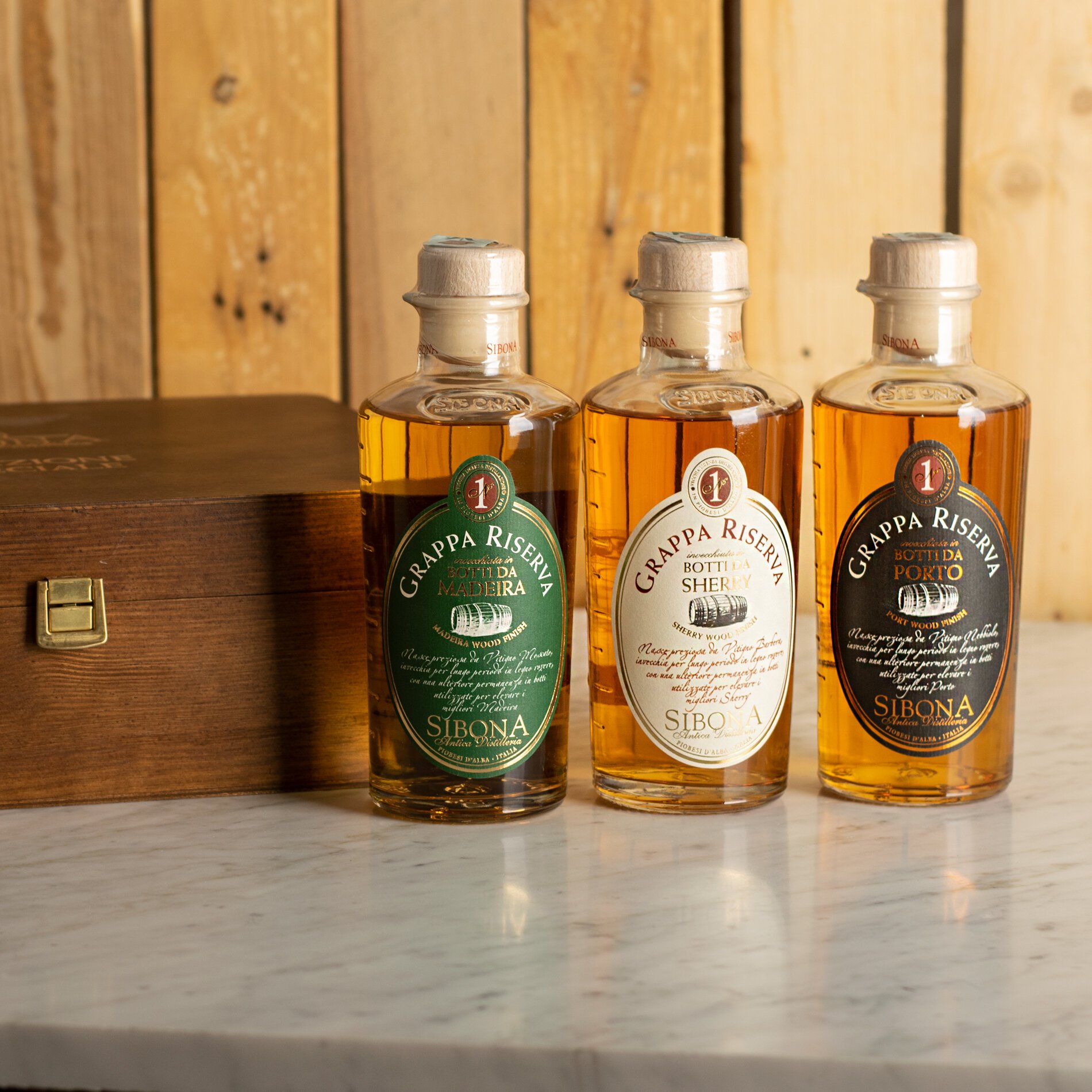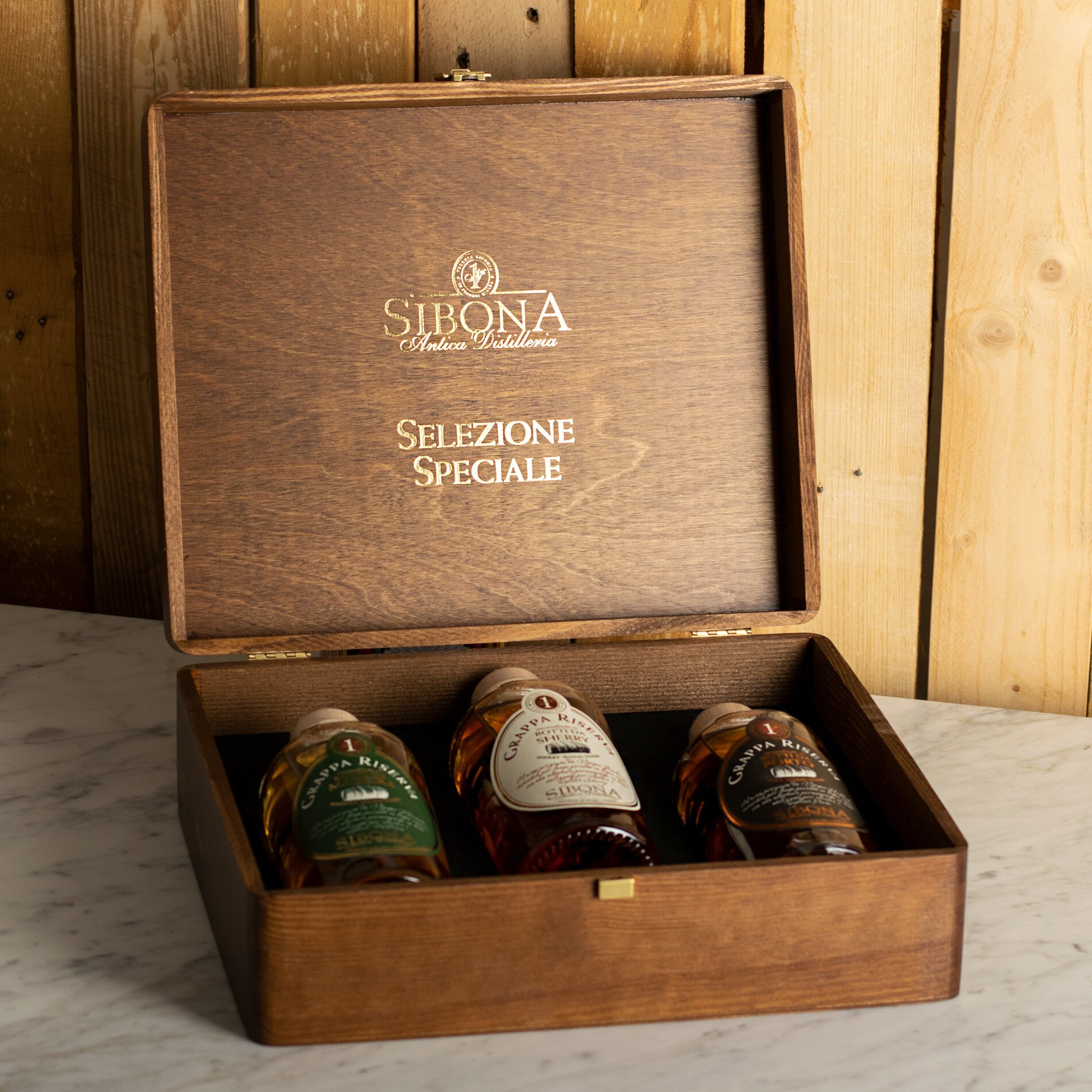 A precious wooden casket with a special lining that contains 3 Reserve grappe Sibona, the best, aged in special barrels, to give you a unique tasting experience.