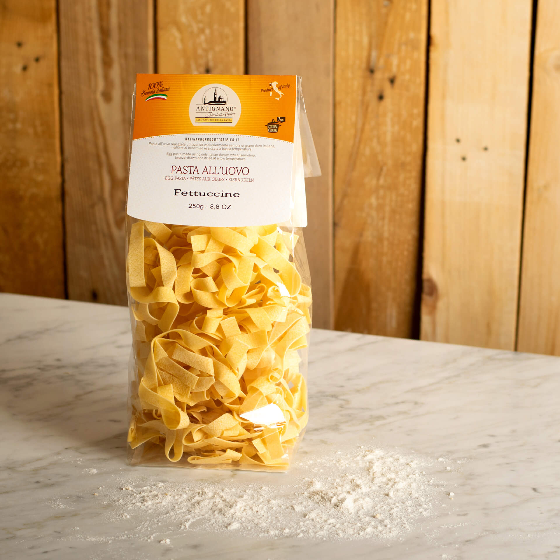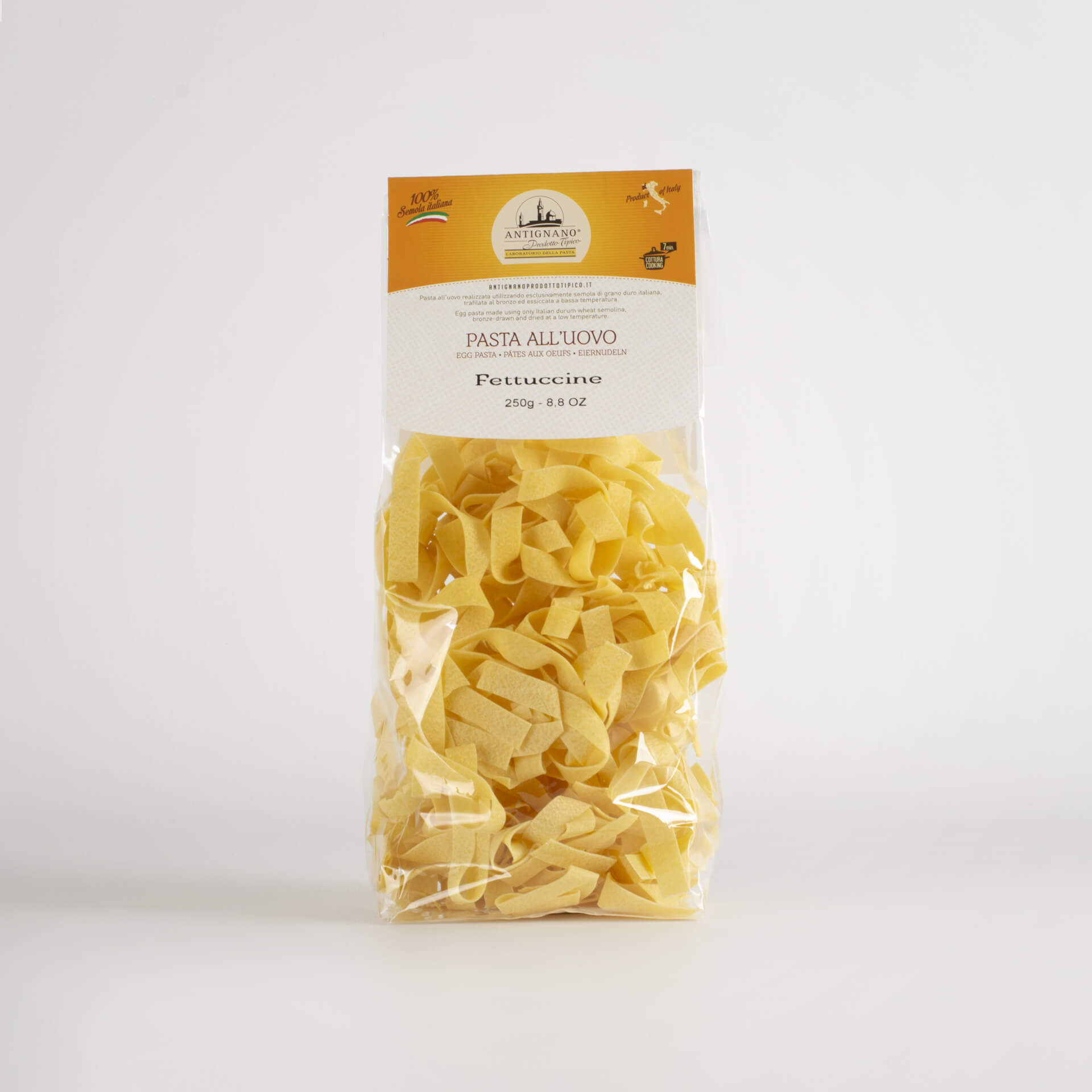 The fettuccine is a traditional product from the village of Antignano. It is made by skilful artisans with a selection of durum wheat flours and fresh eggs. The slow drying process gives the fettuccine a unique and delicious flavour.