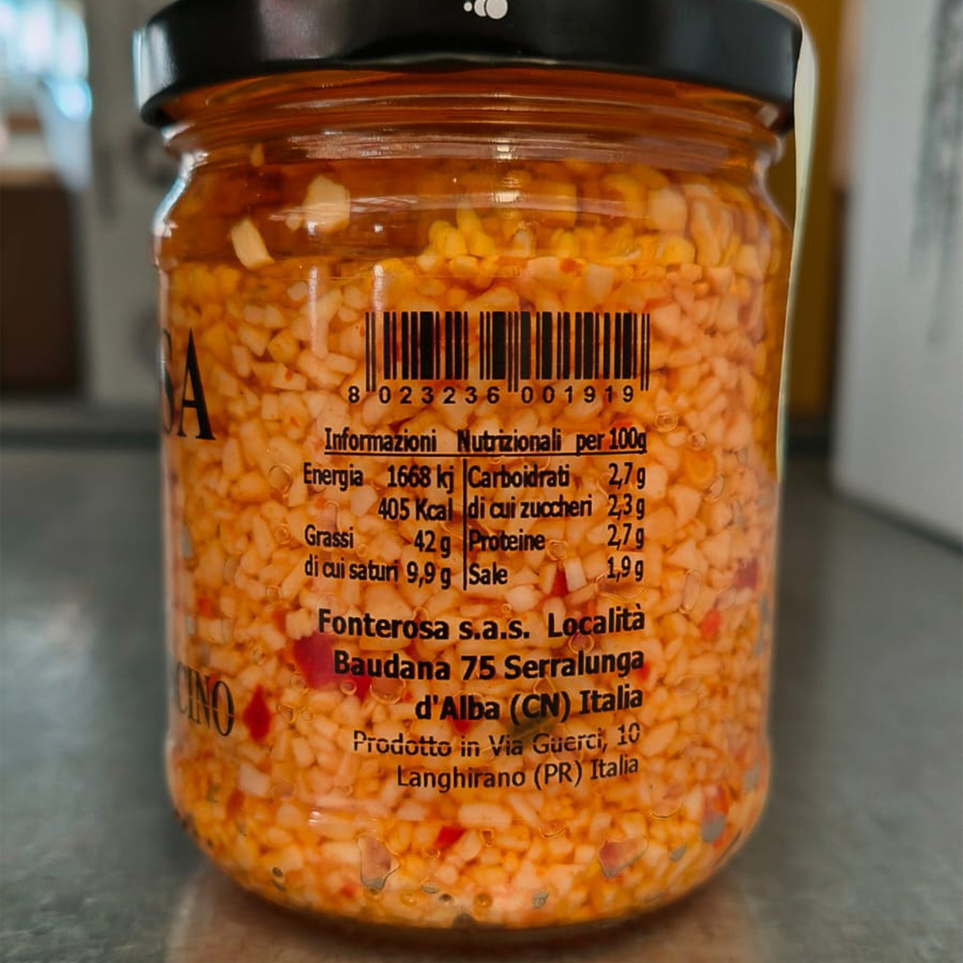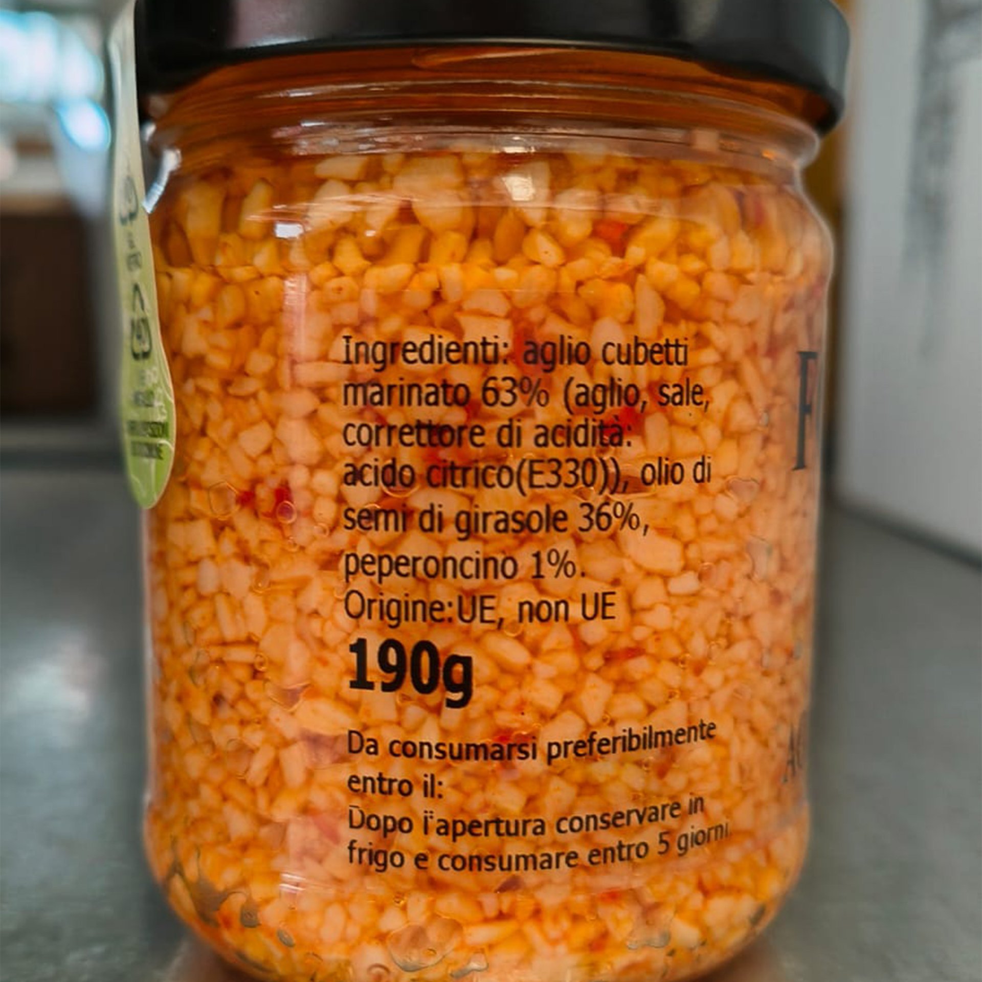 Extra virgin olive oil 53%, garlic 43%, 3% red pepper, vinegar, salt. May contain traces of celery.
