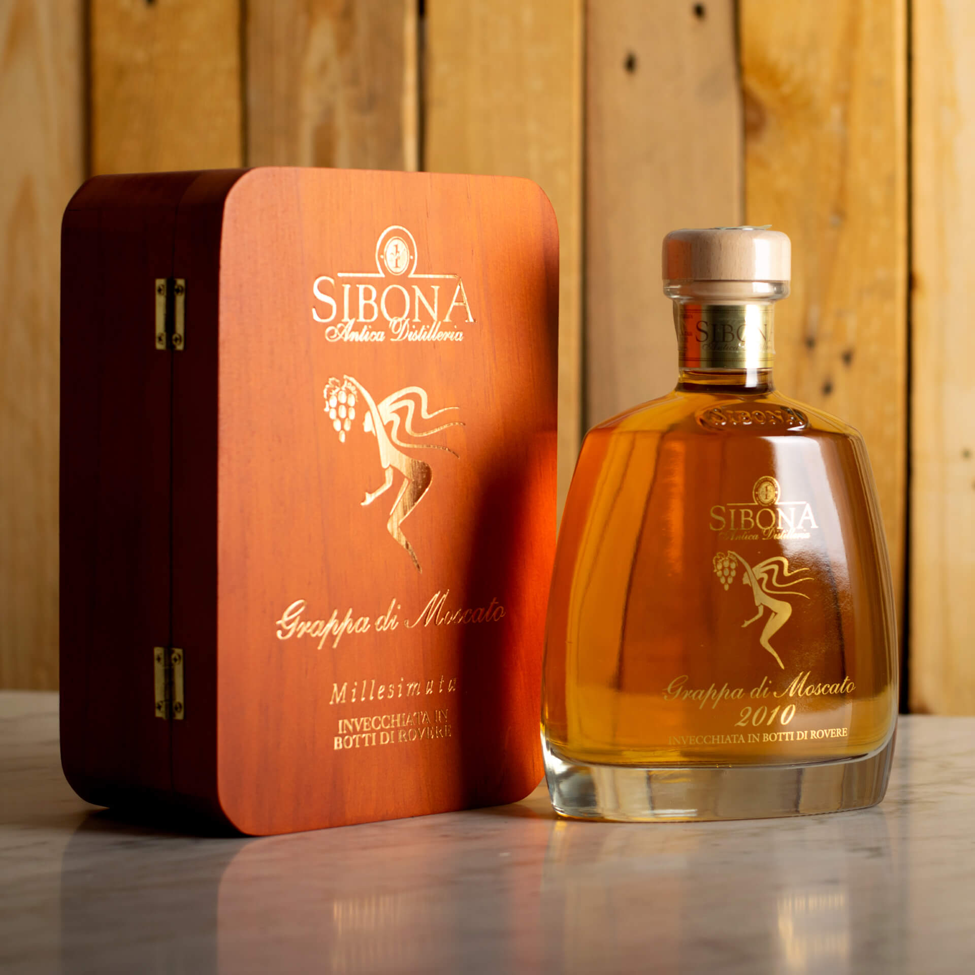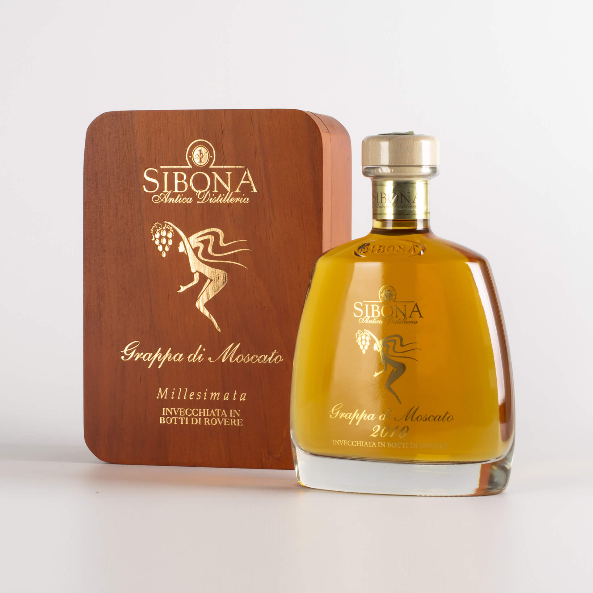 This special vintage grappa derives from a careful distillation of Moscato marc which is followed by a long aging, first in medium-sized barrels and finally in Barriques.