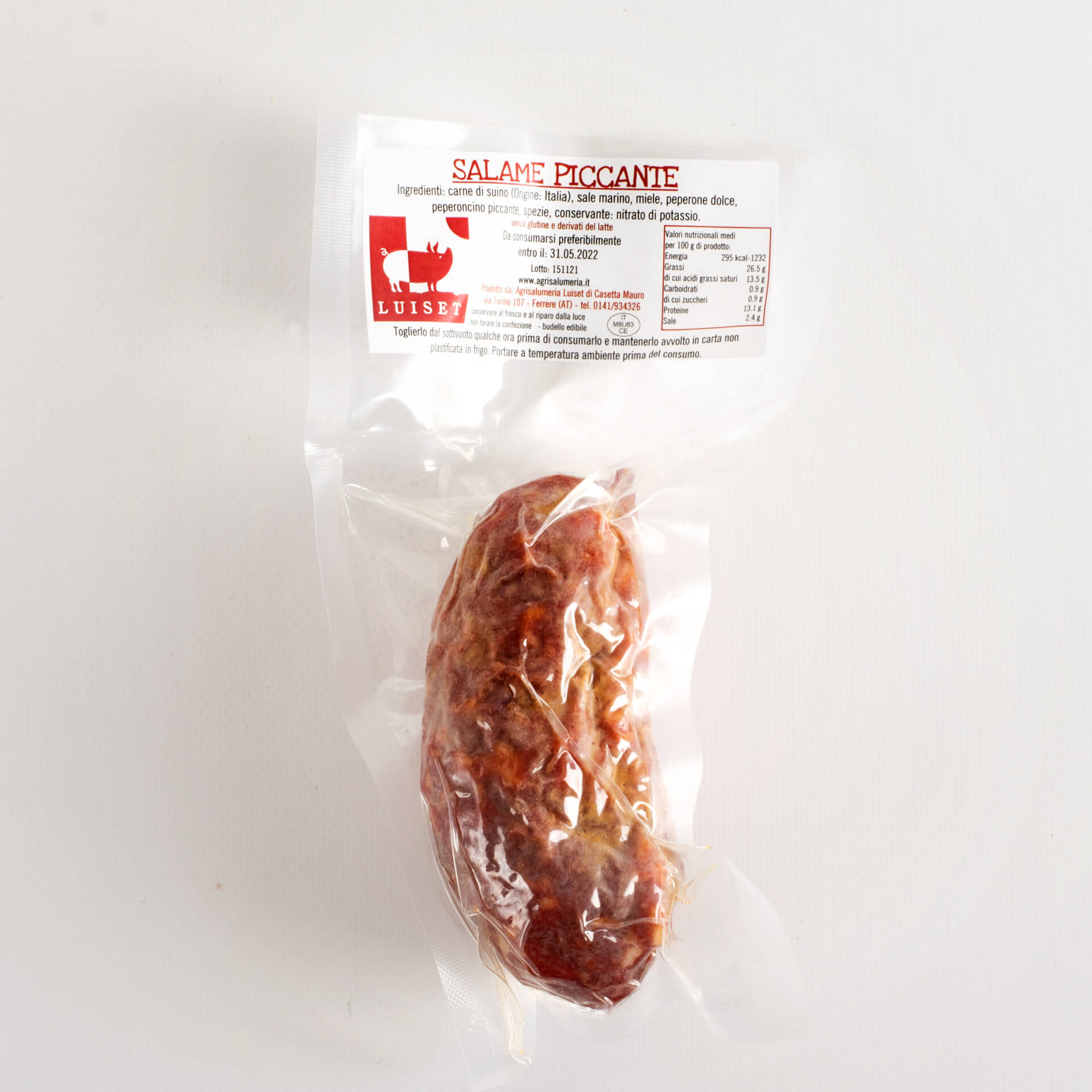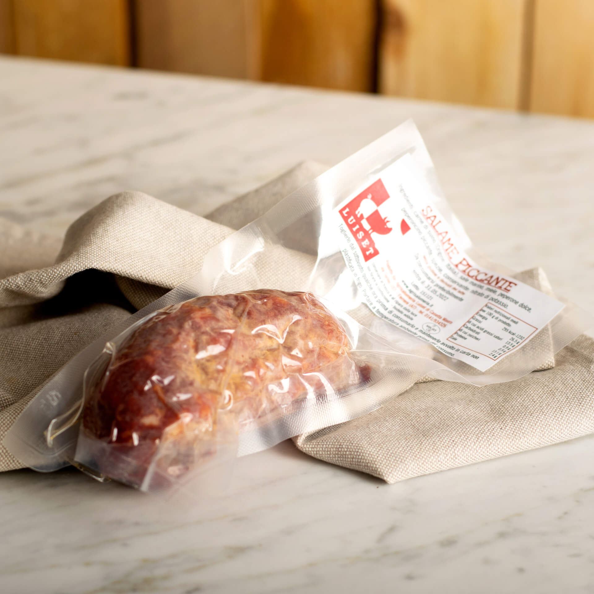 Raw salami prepared with noble pork cuts. Stuffed in natural casing and slowly matured to obtain a product that is soft to the touch and pleasant to the palate. To the mixture of this salami we add sweet and spicy chili peppers to create a pleasantly appetizing flavor.