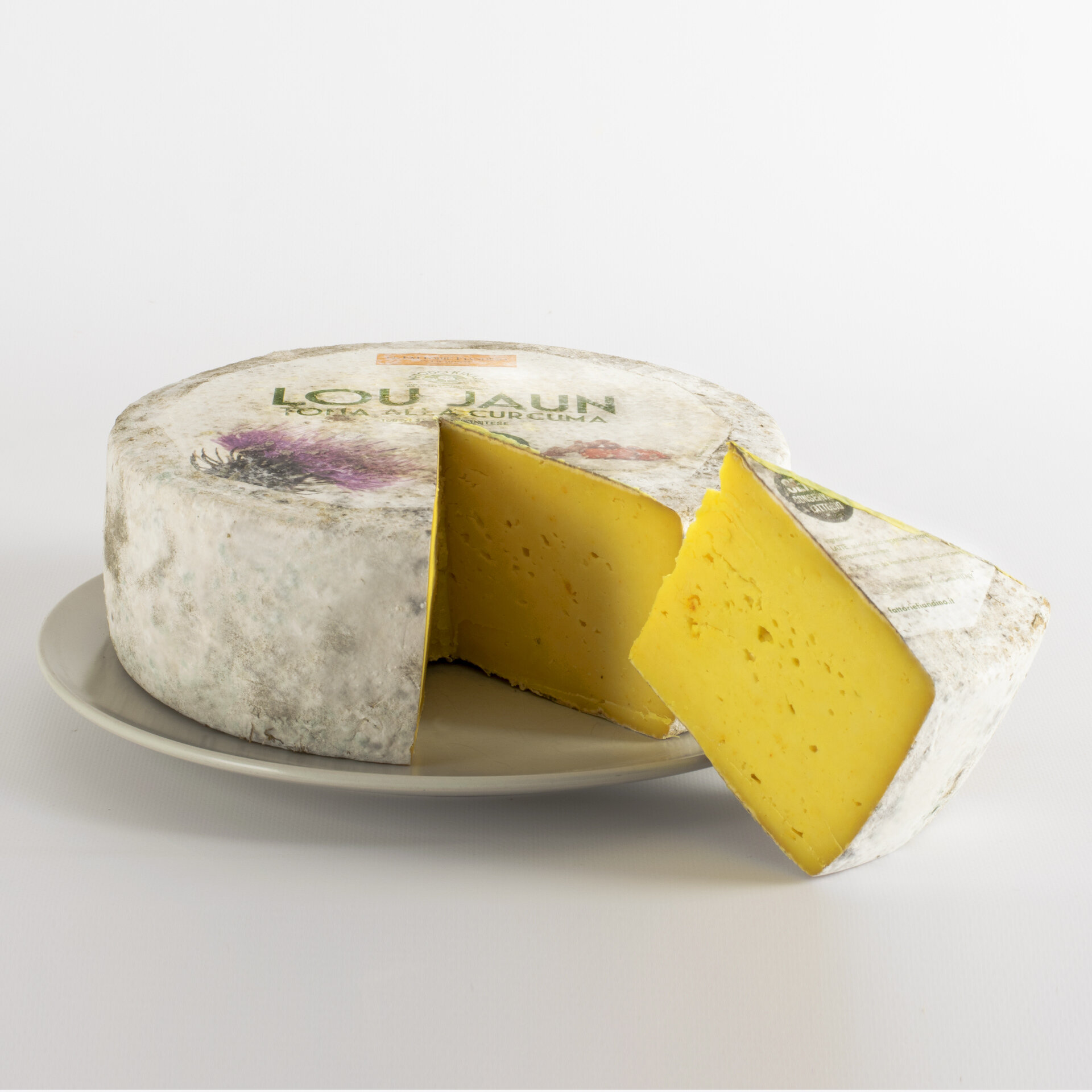 The scent of milk mixes with the aroma of turmeric, the saffron of the Indies, which colours this toma with its typical yellow. Let yourself be enveloped by the sweet and exotic taste of Lou Jaun!