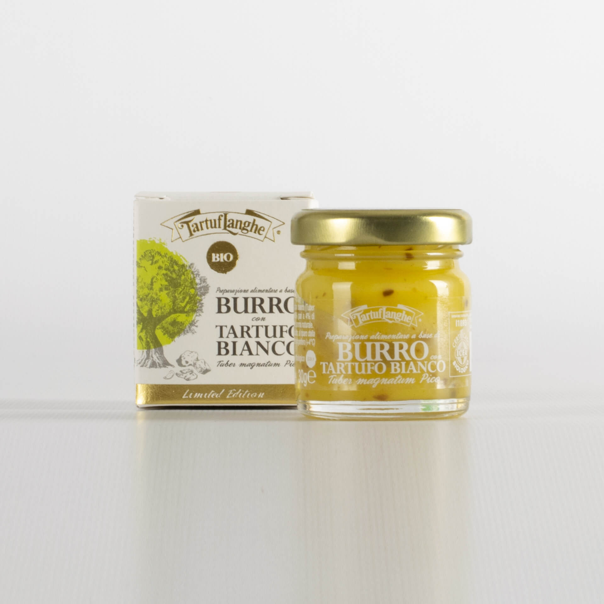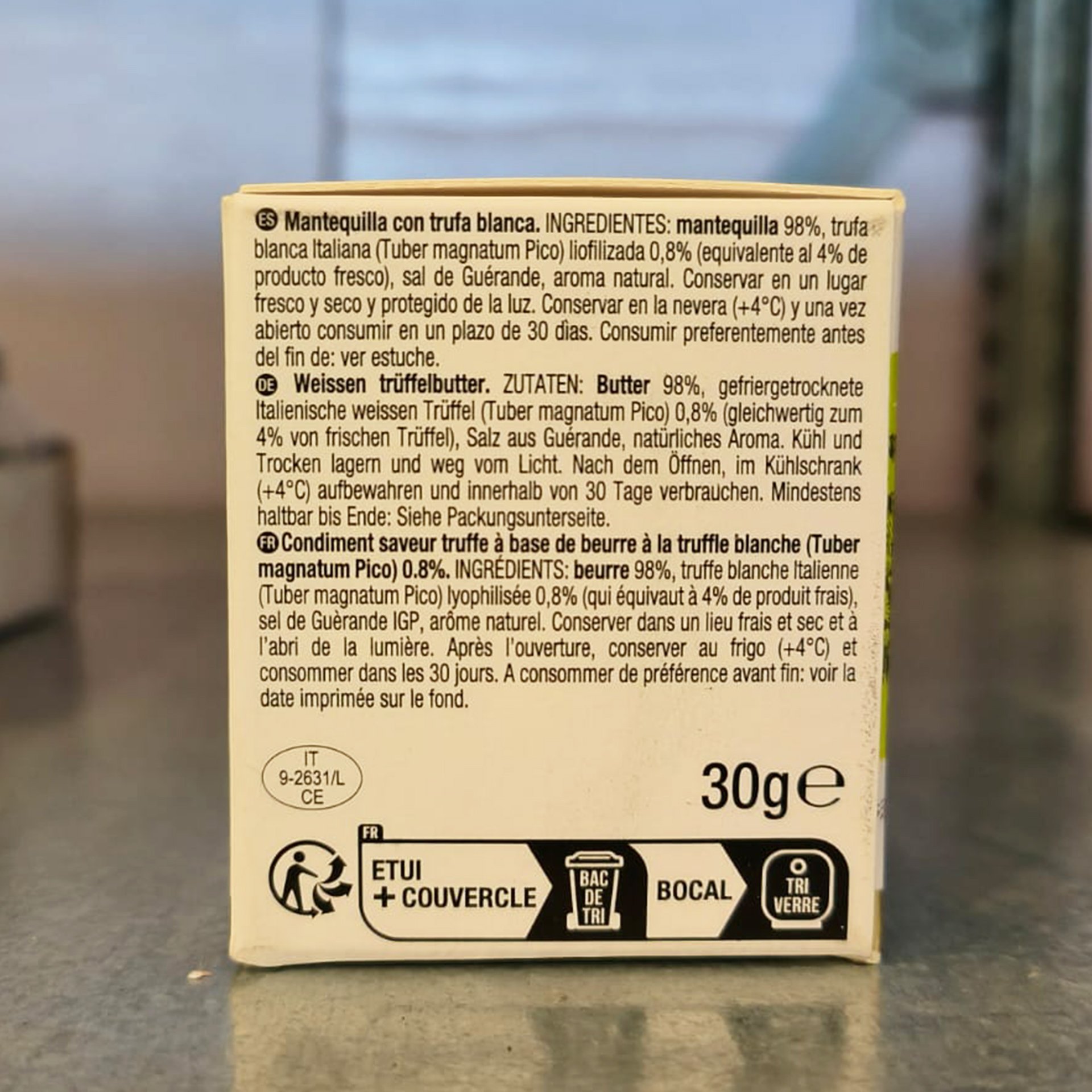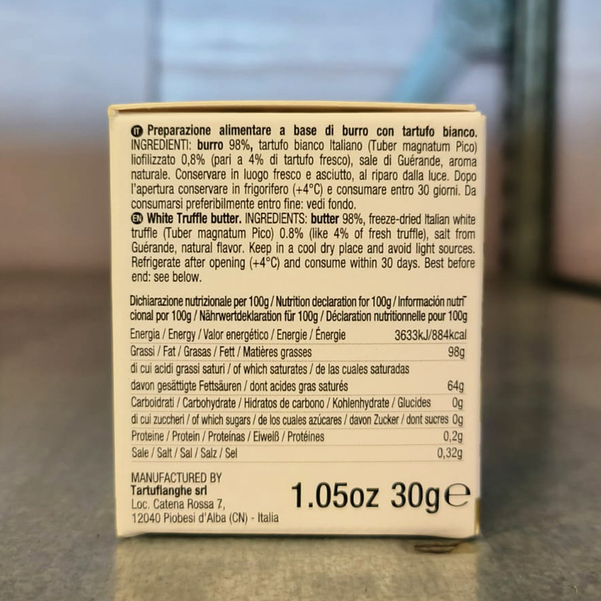 Organic butter 98%, lyophilized organic white truffle (Tuber magnatum Pico) 0,8% just like 4% of fresh truffle), Guèrande salt, natural aroma.