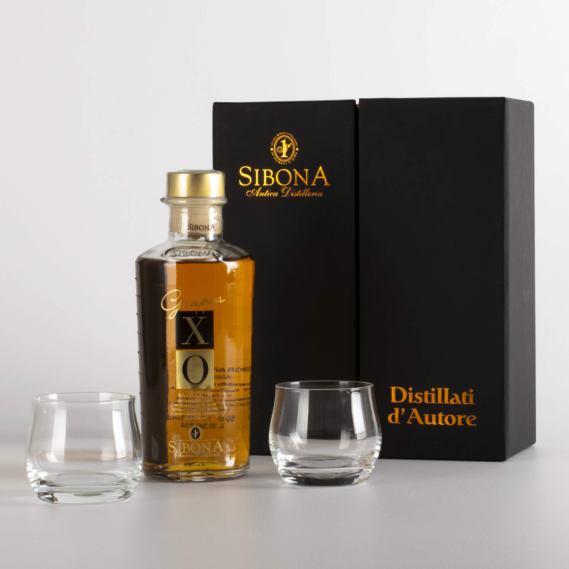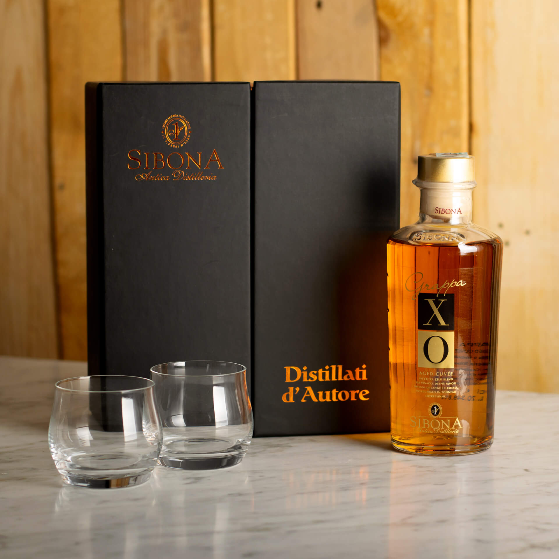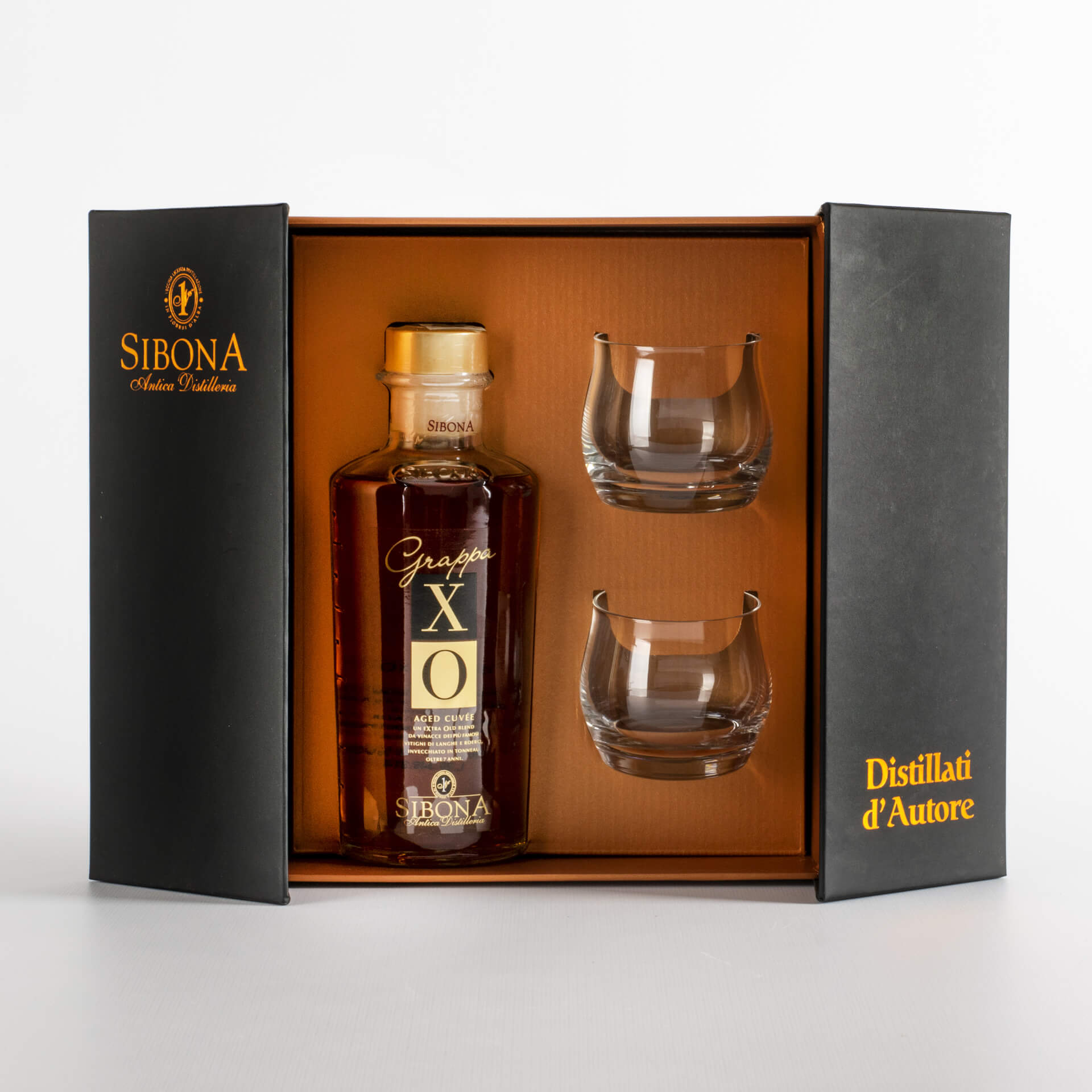 Elegant box made by Sibona including a preciuos Grappa “XO” and two glasses.