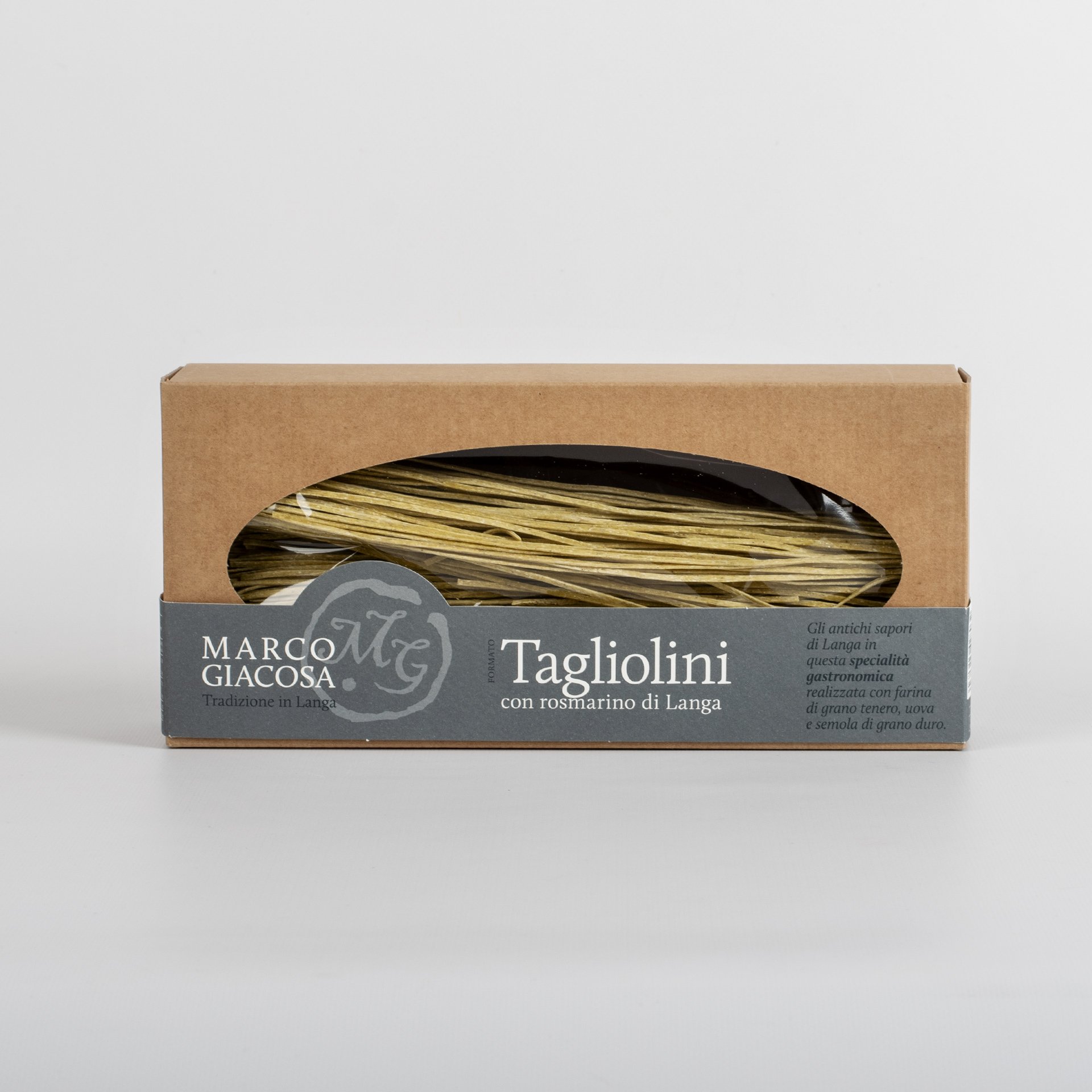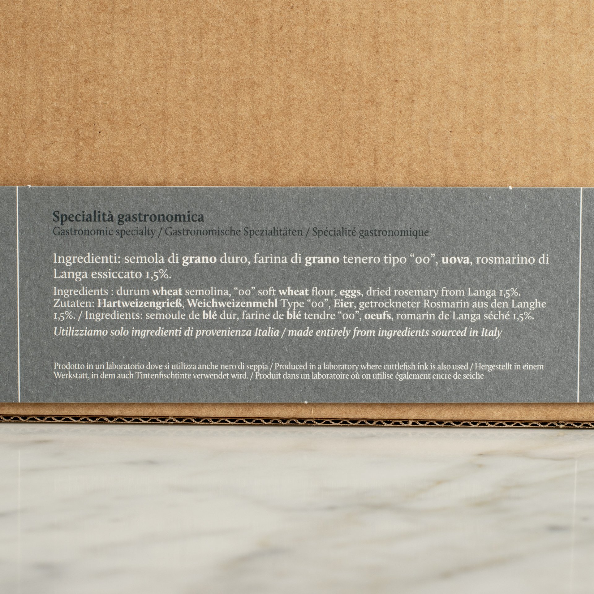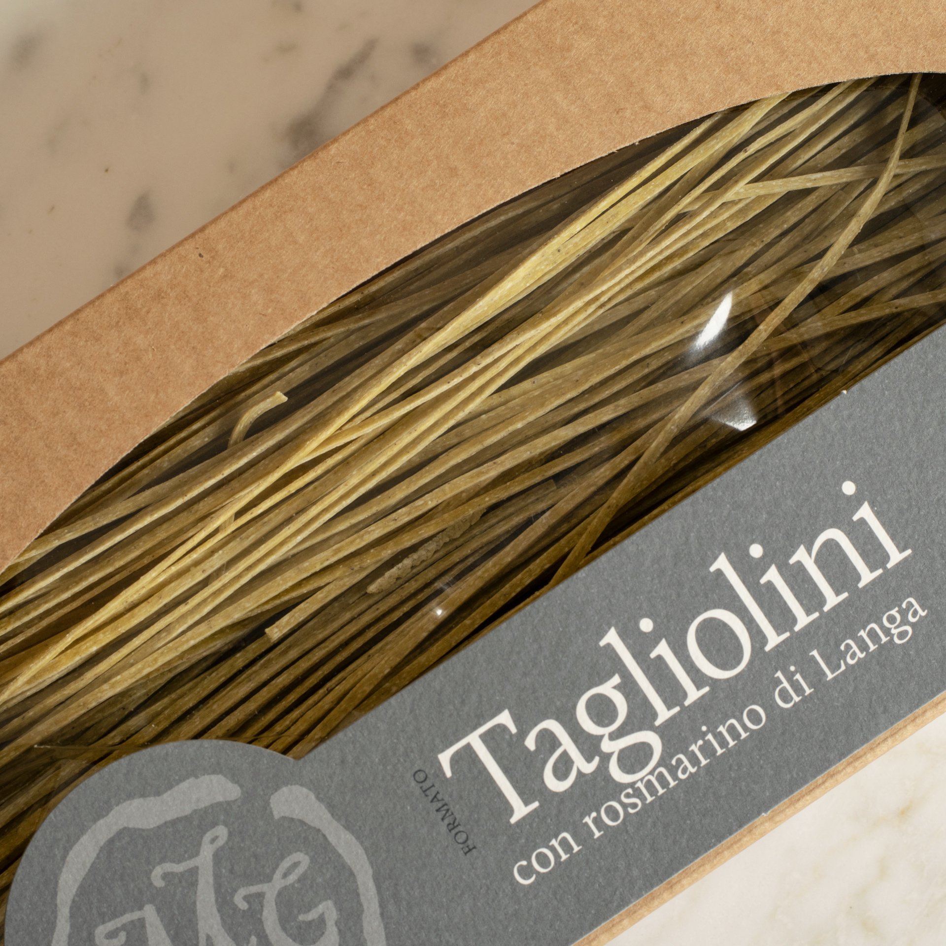 Tagliolini with dried Langa rosemary, fragrant and refined, ideal for dishes with an authentic flavor. Perfect with a rabbit ragù and Taggiasca olives, as suggested on the package, or paired with seafood for a fresh and elegant result.