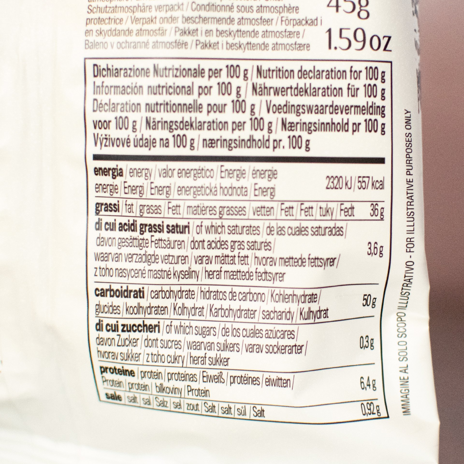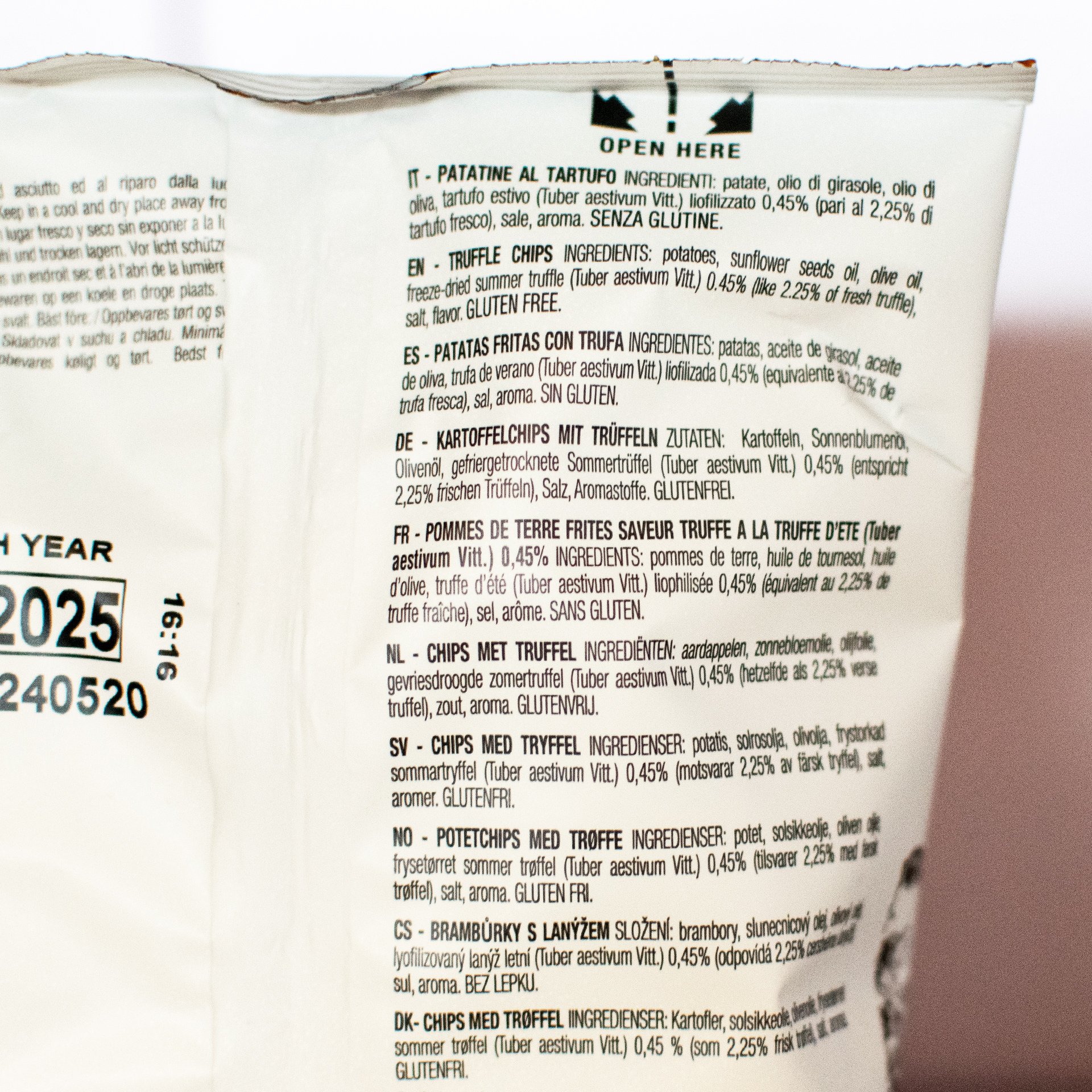 Potatoes, sunflower oil, olive oil, summer truffle (Tuber aestivum Vitt.) Freeze-dried 0.45% (2.25% of fresh truffles), salt, flavor. The product does not contain allergens. GLUTEN FREE.