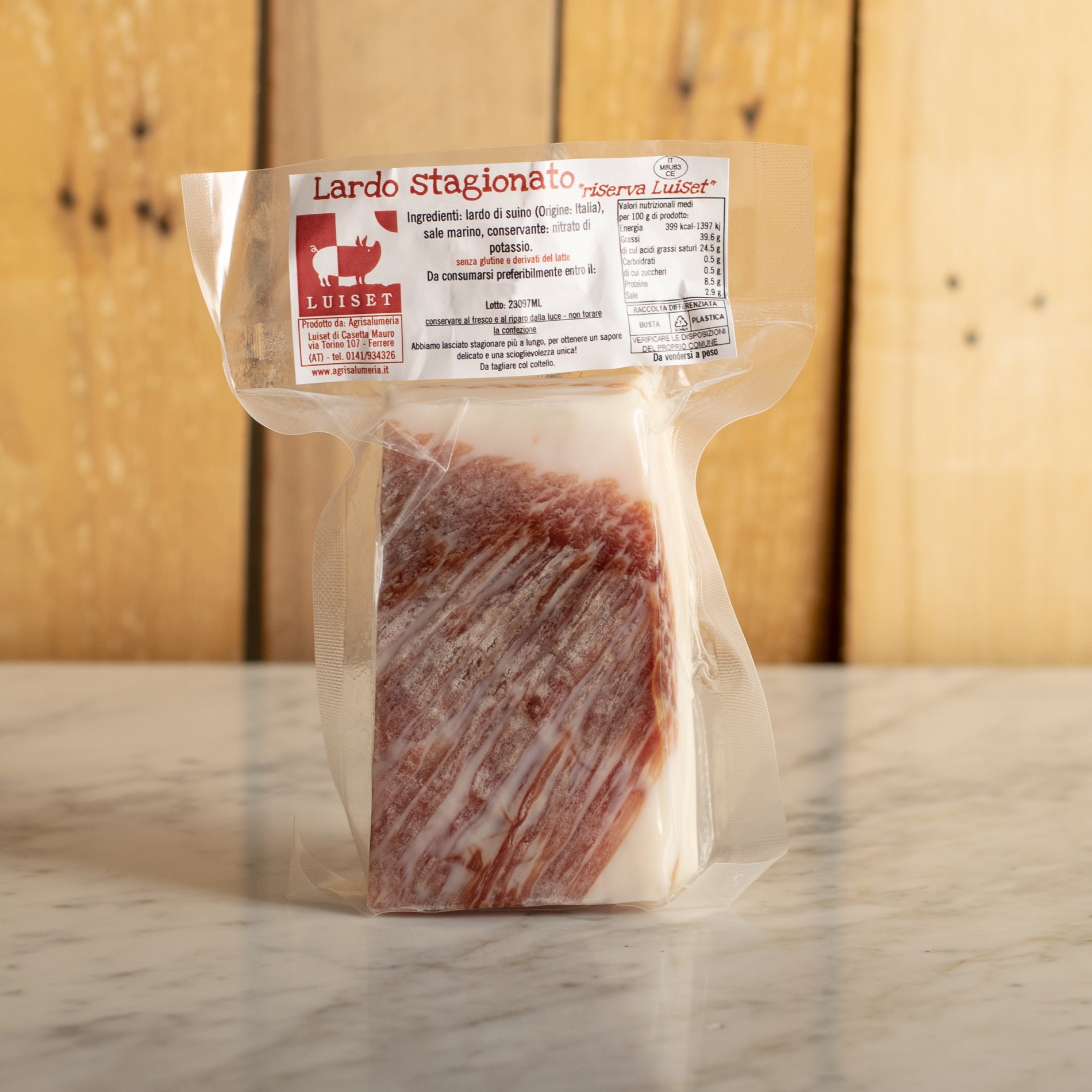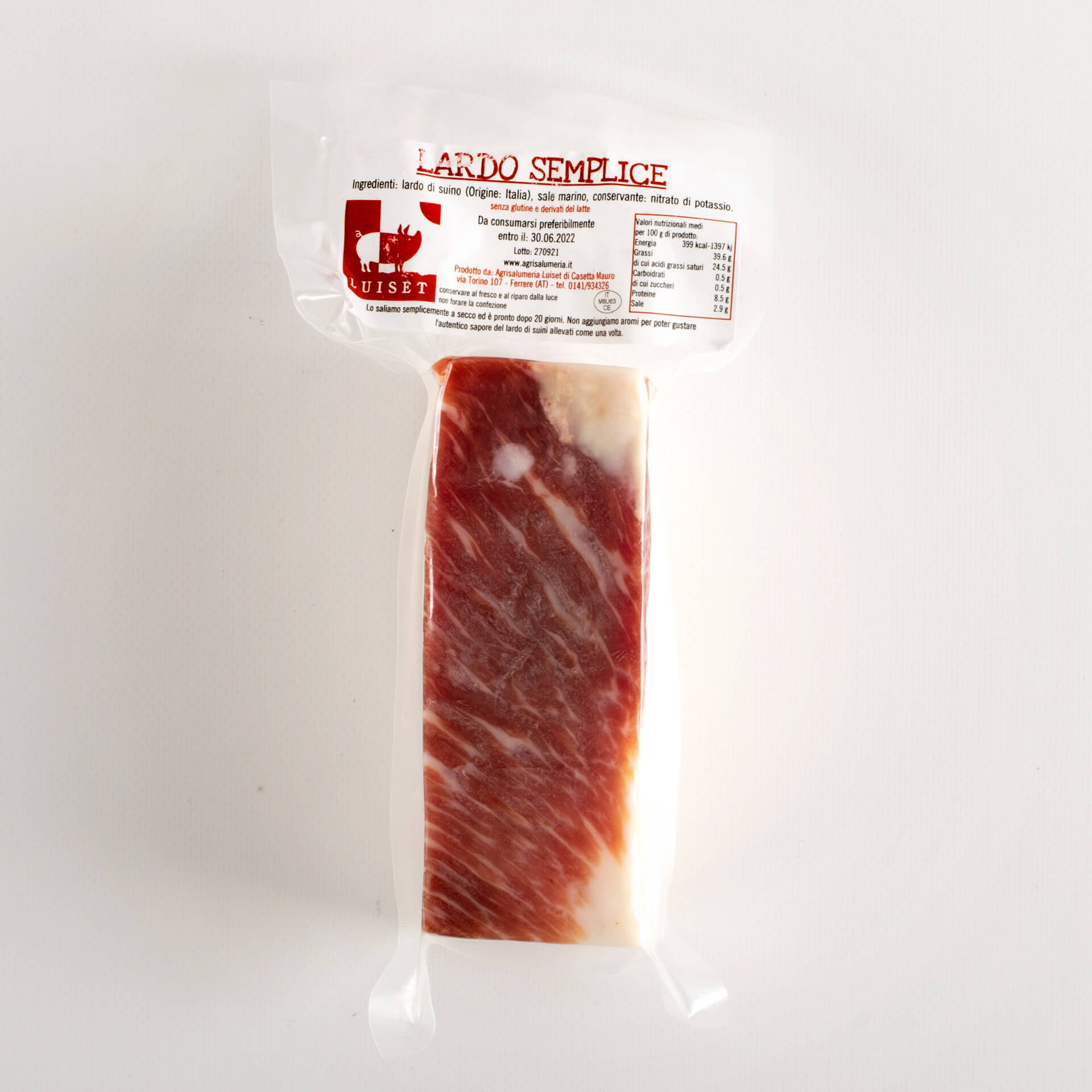 Il lardo è uno strato del grasso sottocutaneo del maiale allevato allo stato semi-brado, come nel caso dell'Agrisalumeria Luiset. Per ottenere questo salume tradizionale italiano, il trancio è salato a secco e stagionato lentamente, per almeno un mese, con spezie ed erbe aromatiche.