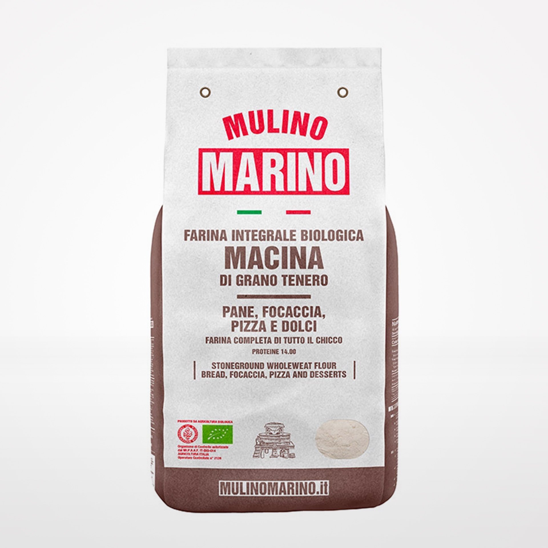Questa farina integrale di grano tenero del Mulino Marino si chiama "Macina". È un prodotto naturale, ottenuto senza l'aggiunta di conservanti, stabilizzanti o altri additivi. Il chicco, selezionato seguendo criteri di qualità, sicurezza e biodiversità, viene lavato, pulito e macinato a pietra naturale interamente senza essere setacciato, ottenendo così una "vera" farina integrale.