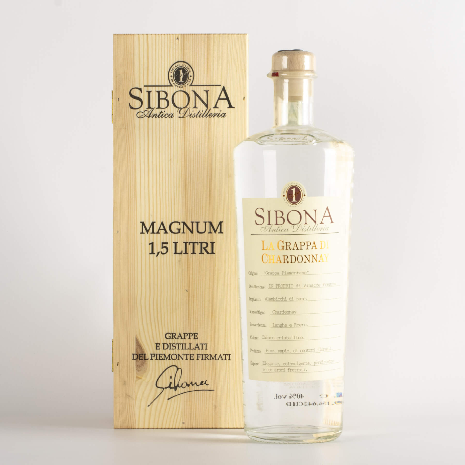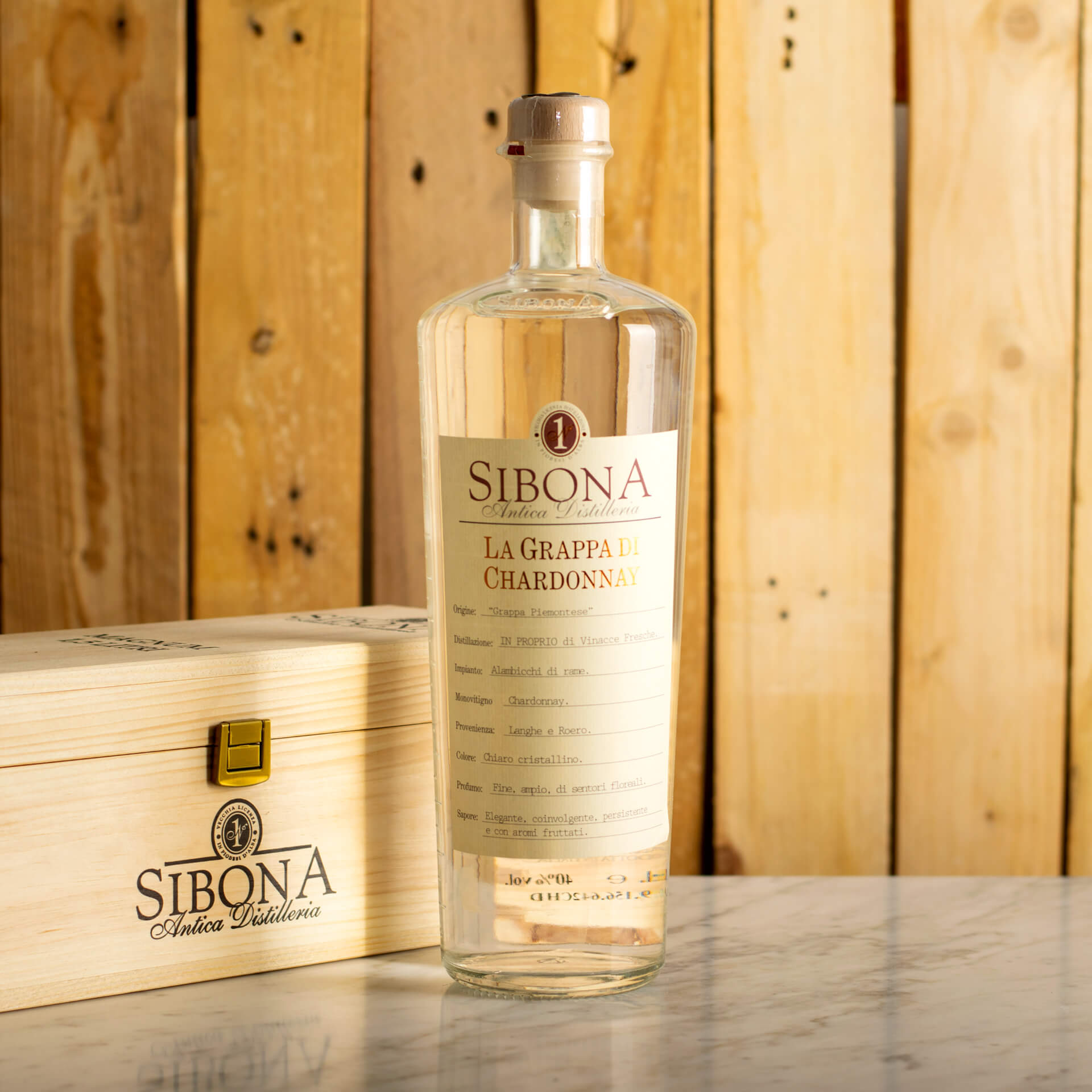 Elegante e prezioso cofanetto in legno contenente la Grappa Chardonnay di distilleria Sibona.