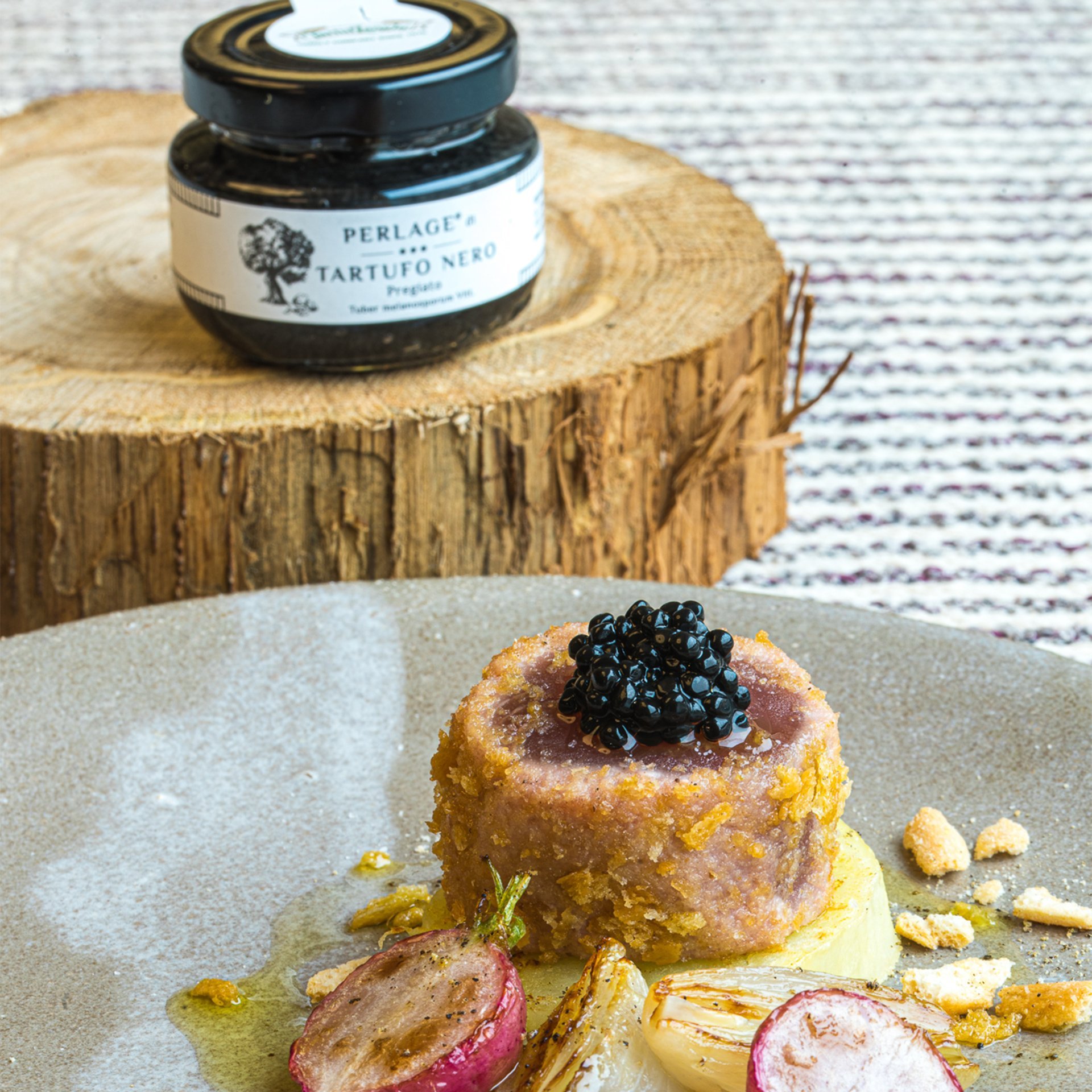 Il gustoso succo di tartufo nero pregiato, ottenuto per estrazione diretta dal tartufo durante la sua cottura, viene “sferificato” attraverso una tecnica molto sofisticata, reso cioè in piccole sfere o perle dal gusto di tartufo, simili per colore e consistenza al caviale.