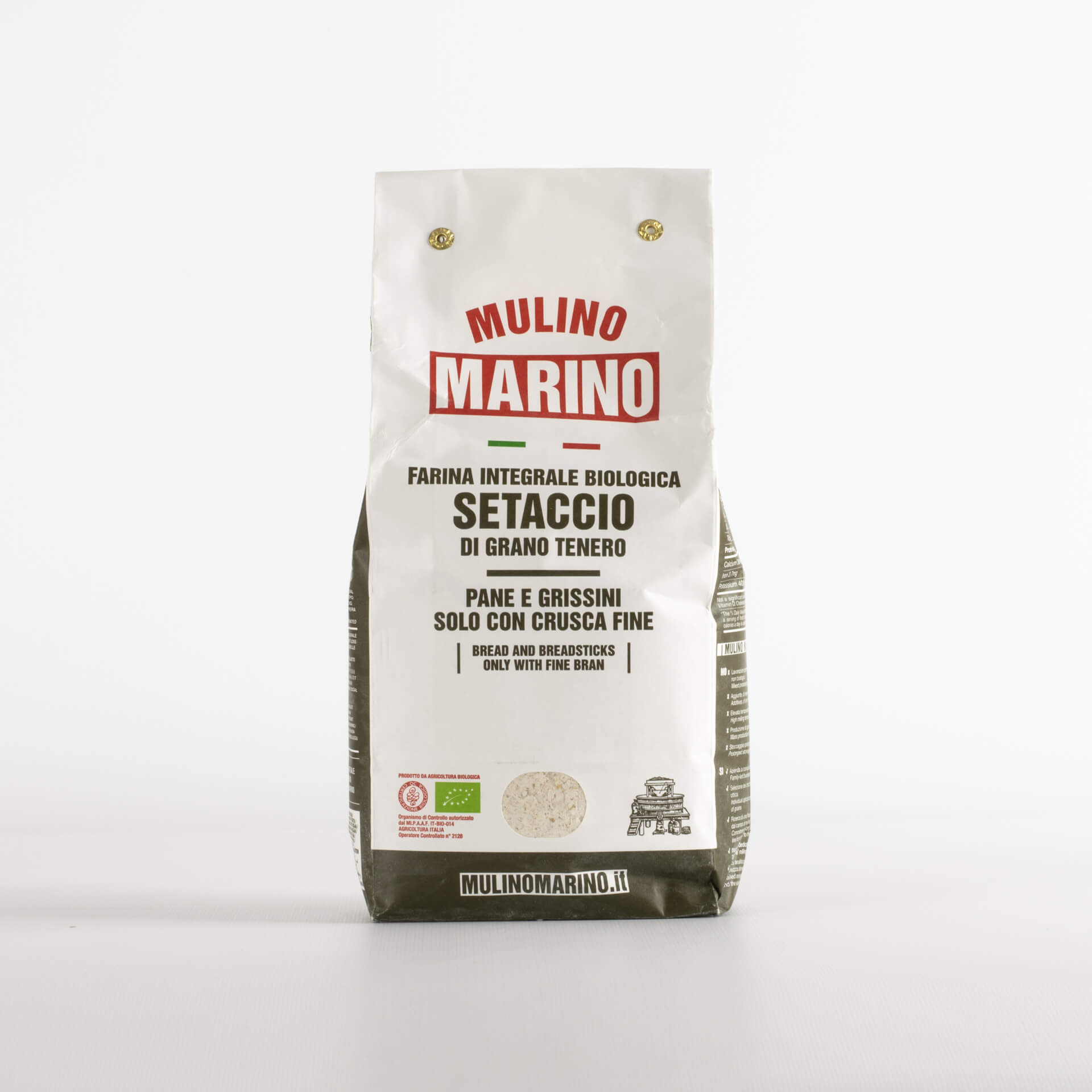 La "Setaccio" è la farina semi-integrale di grano tenero del Mulino Marino. Il chicco viene lavato, pulito e macinata a pietra naturale, inoltre gli viene tolta la parte di crusca (fibra) piu spessa, per avere una farina in tutto e per tutto integrale, ma con una quantità di crusca minore.