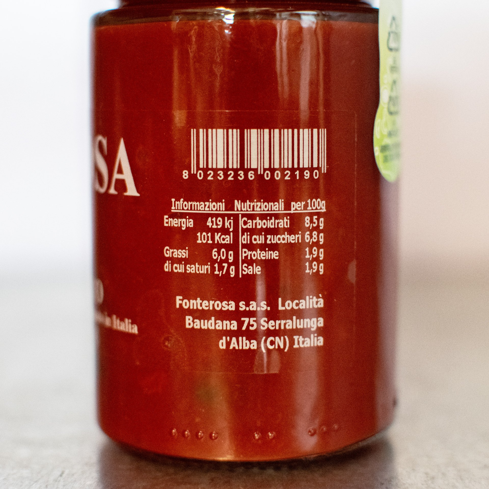 Dalla polpa dei pomodori maturati sulle nostre colline e il basilico otteniamo un sugo particolarmente gustoso e delizioso.